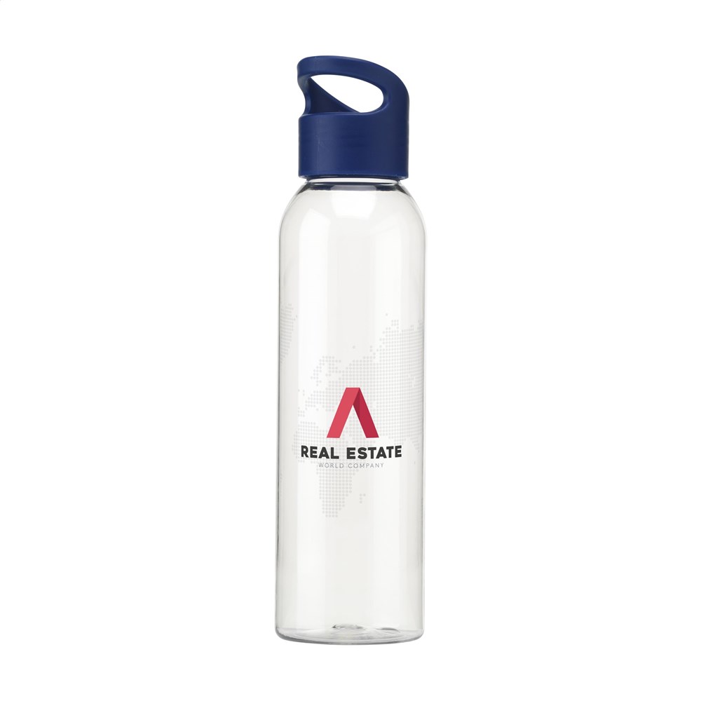 Luxe waterfles van helder RPET. Met praktische, kunststof schroefdop. Llekvrij en herbruikbaar. Niet vaatwasserbestendig. Inhoud 650 ml. GRS-gecertificeerd. Totaal gerecycled materiaal: 82%.