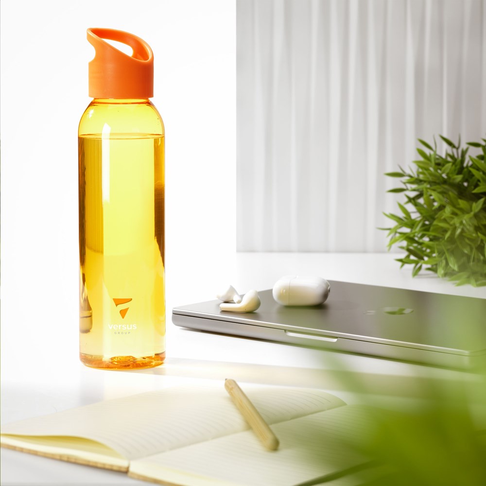Luxe waterfles van helder RPET. Met praktische, kunststof schroefdop. Llekvrij en herbruikbaar. Niet vaatwasserbestendig. Inhoud 650 ml. GRS-gecertificeerd. Totaal gerecycled materiaal: 82%.