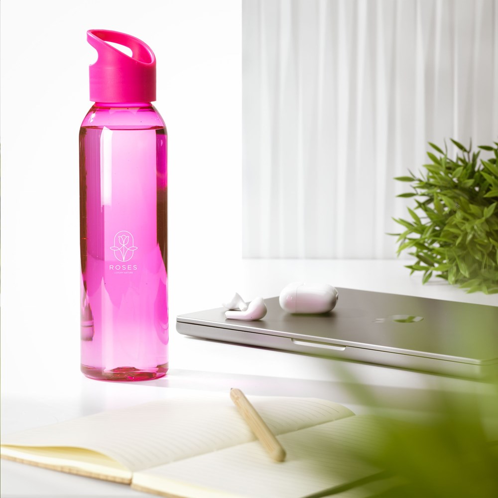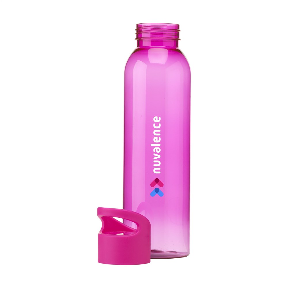 Luxe waterfles van helder RPET. Met praktische, kunststof schroefdop. Llekvrij en herbruikbaar. Niet vaatwasserbestendig. Inhoud 650 ml. GRS-gecertificeerd. Totaal gerecycled materiaal: 82%.