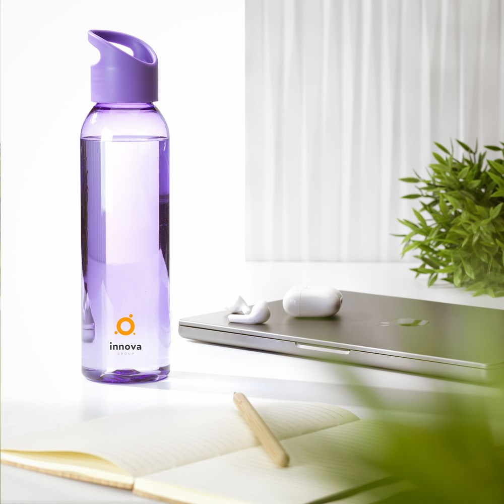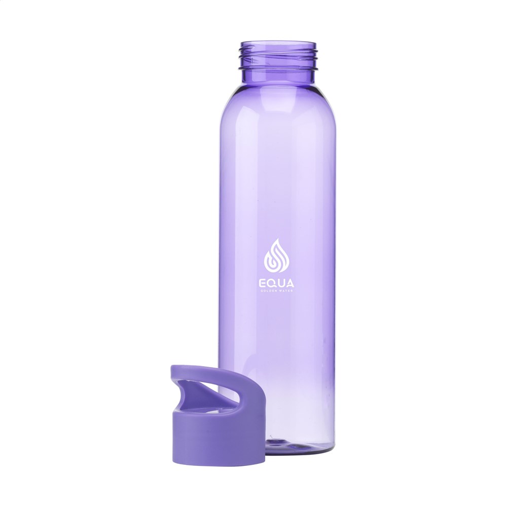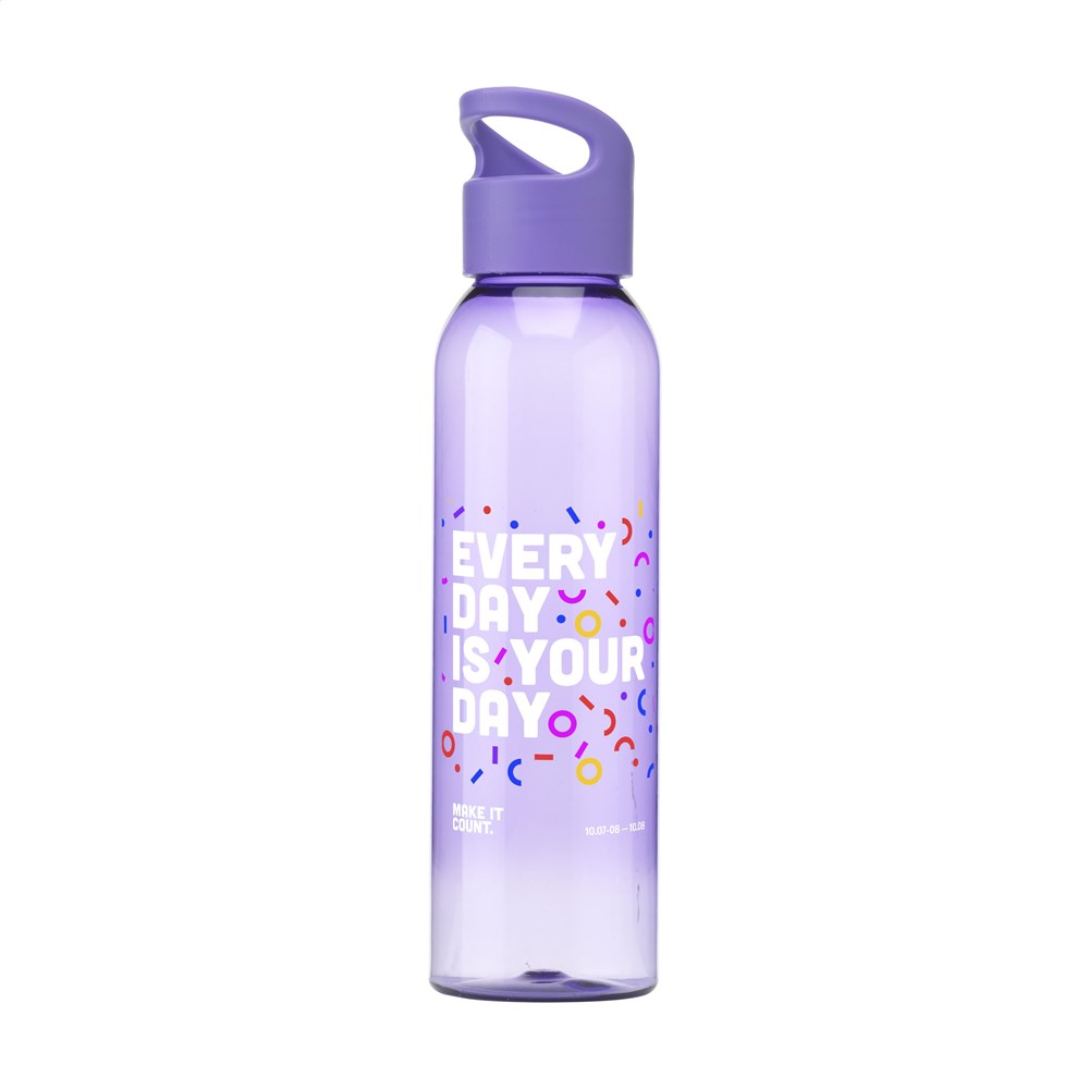 Luxe waterfles van helder RPET. Met praktische, kunststof schroefdop. Llekvrij en herbruikbaar. Niet vaatwasserbestendig. Inhoud 650 ml. GRS-gecertificeerd. Totaal gerecycled materiaal: 82%.