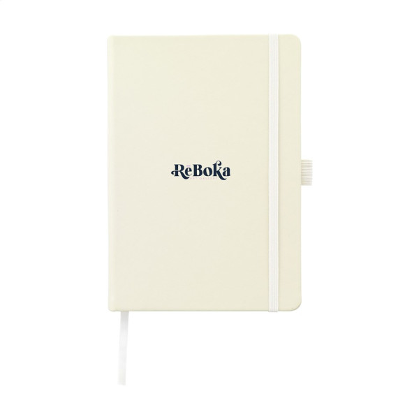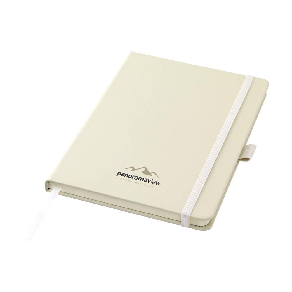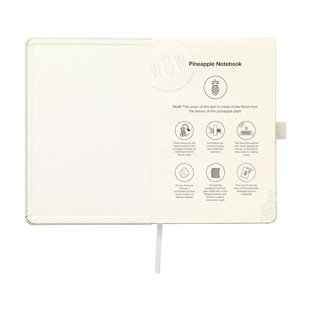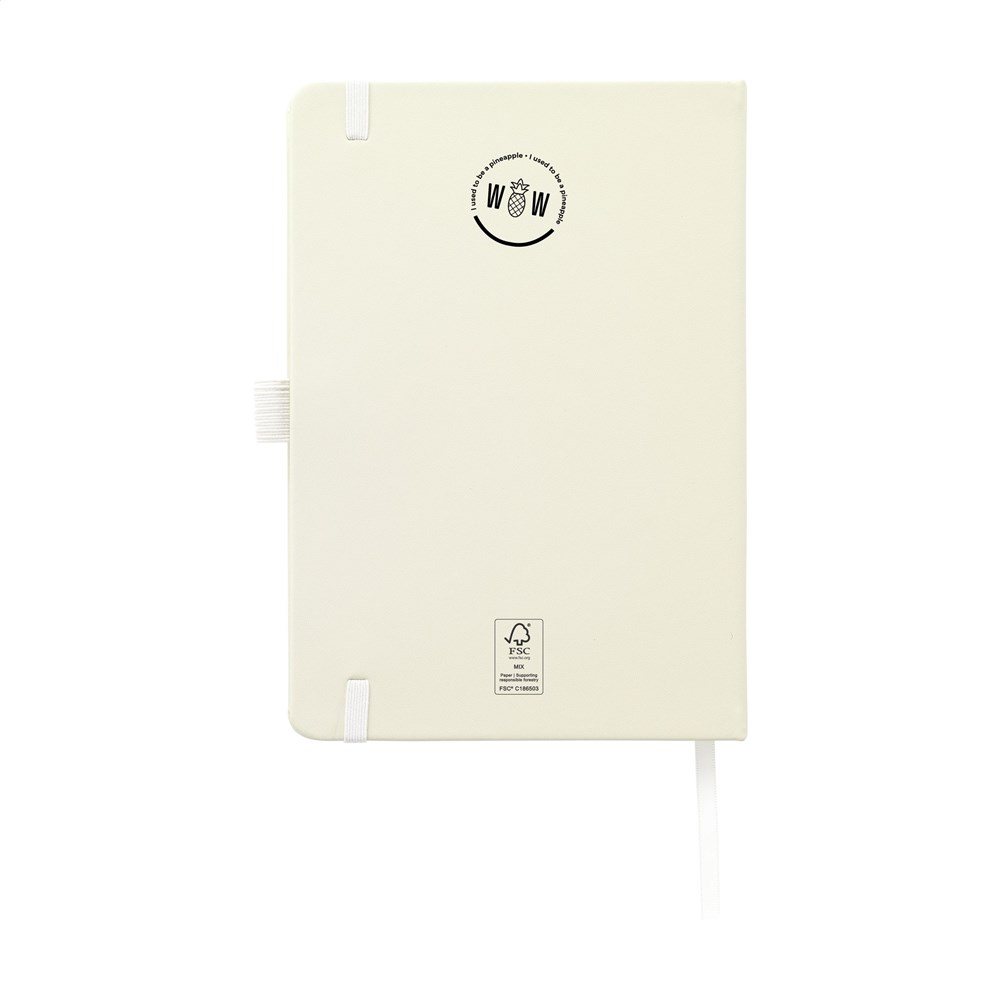 A5-notitieboek met een hard cover gemaakt van ananas-imitatieleer. Dit materiaal is vervaardigd met 30% hergebruikte ananascomponenten. Dit notitieboek heeft ca. 80 vel/160 pagina's wit, gelinieerd FSC Mix gecertificeerd papier (80 g/m²) en is voorzien van een sluitelastiek, een gebonden rug, penlus en leeslint. Het vegan imitatieleer is vrijwel niet van echt leer te onderscheiden. Het materiaal is echter vervaardigd uit ananasbladeren, een restproduct van de ananasteelt. Om die reden zijn er ook geen extra stoffen nodig, zoals water, mest of pesticiden voor de productie ervan. De vezels van het ananasblad worden gewassenen, verrijkt met PU en gedroogd in de oven. Het resultaat? Soepele vellen veganistisch imitatieleer, die vervolgens worden voorzien van een prachtige afwerking. Na het drogen ontstaat een zacht en aantrekkelijk materiaal met de eigenschappen van leer. Het bestaat deels uit fruitresten en deels uit PU.
