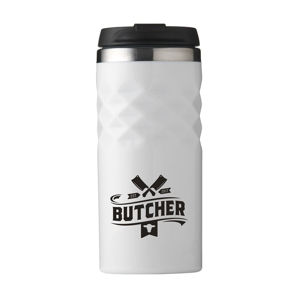 Dubbelwandige thermosbeker gemaakt van gerecycled RVS. Met schroefdeksel en klikopening. De beker heeft een opvallend 3D-geometrisch diamantpatroon in de houder. Slipvaste onderzijde. Niet vaatwasserbestendig. RCS-gecertificeerd. Totaal gerecycled materiaal: 74%. Inhoud 280 ml. RVS kan vele malen gerecycled worden terwijl de kwaliteit van het materiaal grotendeels behouden blijft. Door het gebruik van gerecycled RVS worden minder nieuwe grondstoffen gebruikt. Dit betekent minder energieverbruik en minder gebruik van water. Per stuk verpakt.