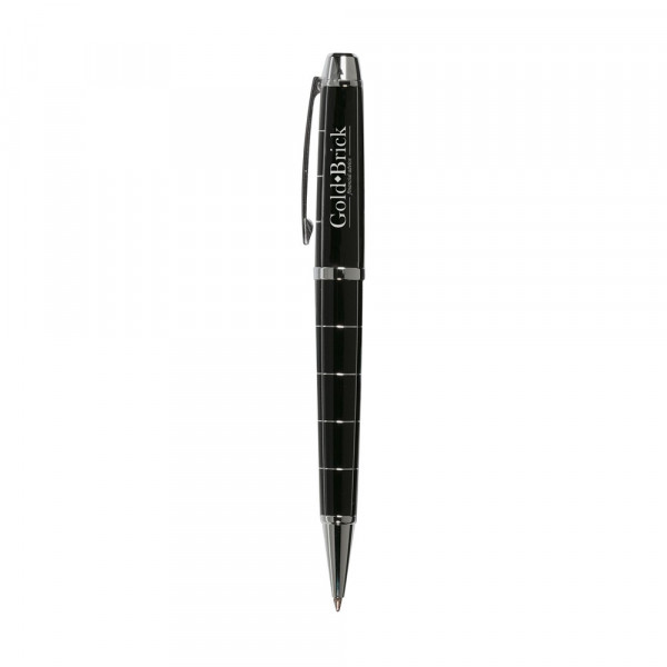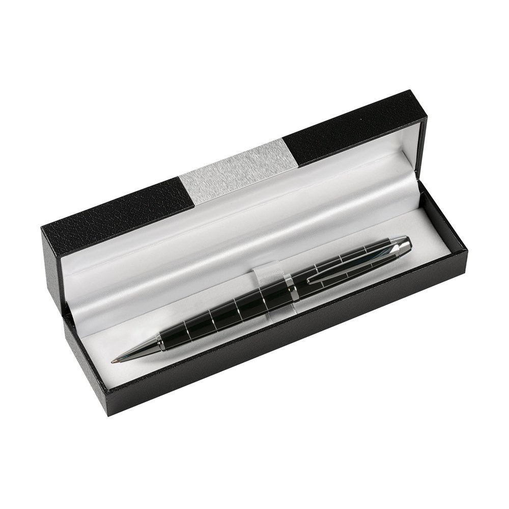 Blauwschrijvende balpen met metalen accenten en draaikliksysteem, metalen clip/top, puntstuk en tussenring. In cassette.