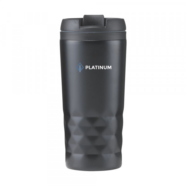 Dubbelwandige RVS thermosbeker met schroefdeksel en klikopening. PP binnenwand. Met opvallend 3D-geometrisch diamantpatroon in de houder. Slipvaste onderzijde. Niet vaatwasserbestendig. Inhoud 300 ml. Per stuk verpakt.