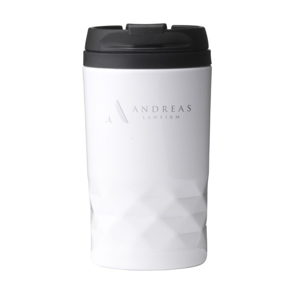 Dubbelwandigethermosbeker gemaakt van gerecycled RVS. Met een kunststof binnenwand, schroefdeksel en klikopening. De beker heeft een opvallend 3D-geometrisch diamantpatroon in de houder. Slipvaste onderzijde. Niet vaatwasserbestendig. Zonder deksel heeft de beker een hoogte van 12,4 cm en daarmee past hij onder nagegoeg alle koffieapparaten. RCS-gecertificeerd. Totaal gerecycled materiaal: 47%. Inhoud 250 ml. RVS kan vele malen gerecycled worden terwijl de kwaliteit van het materiaal grotendeels behouden blijft. Door het gebruik van gerecycled RVS worden minder nieuwe grondstoffen gebruikt. Dit betekent minder energieverbruik en minder gebruik van water. Per stuk verpakt.