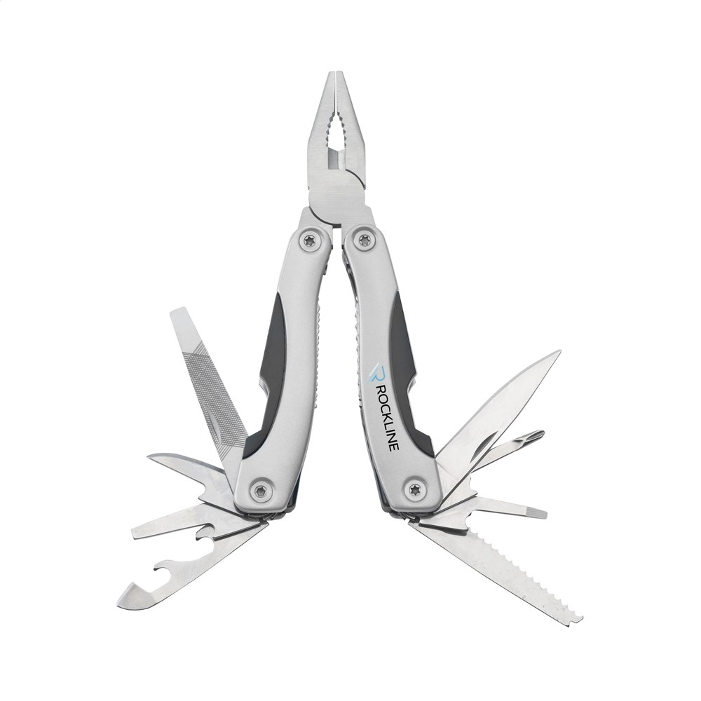 Compacte RVS multitang met aluminium handgreep in metallic look. 9-delig met 13 functies: tang, draadknipper, 3 schroevendraaiers, philips kruiskopschroevendraaier, vijl, zaag/visschraper, mes, priem, blikopener, flesopener. In 600D nylon etui. Op het bezit en/of dragen van messen of multitools in het openbaar kunnen lokale regels van toepassing zijn. Per stuk in kraft doos.