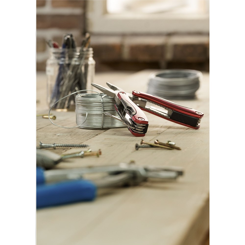 Compacte RVS multitang met aluminium handgreep in metallic look. 9-delig met 13 functies: tang, draadknipper, 3 schroevendraaiers, priem, vijl, blikopener, flesopener, visschraper, visonthaker, mes, philips kruiskopschroevendraaier. Met vergrendeling. In nylon etui. Op het bezit en/of dragen van messen of multitools in het openbaar kunnen lokale regels van toepassing zijn. Per stuk in kraft doos.