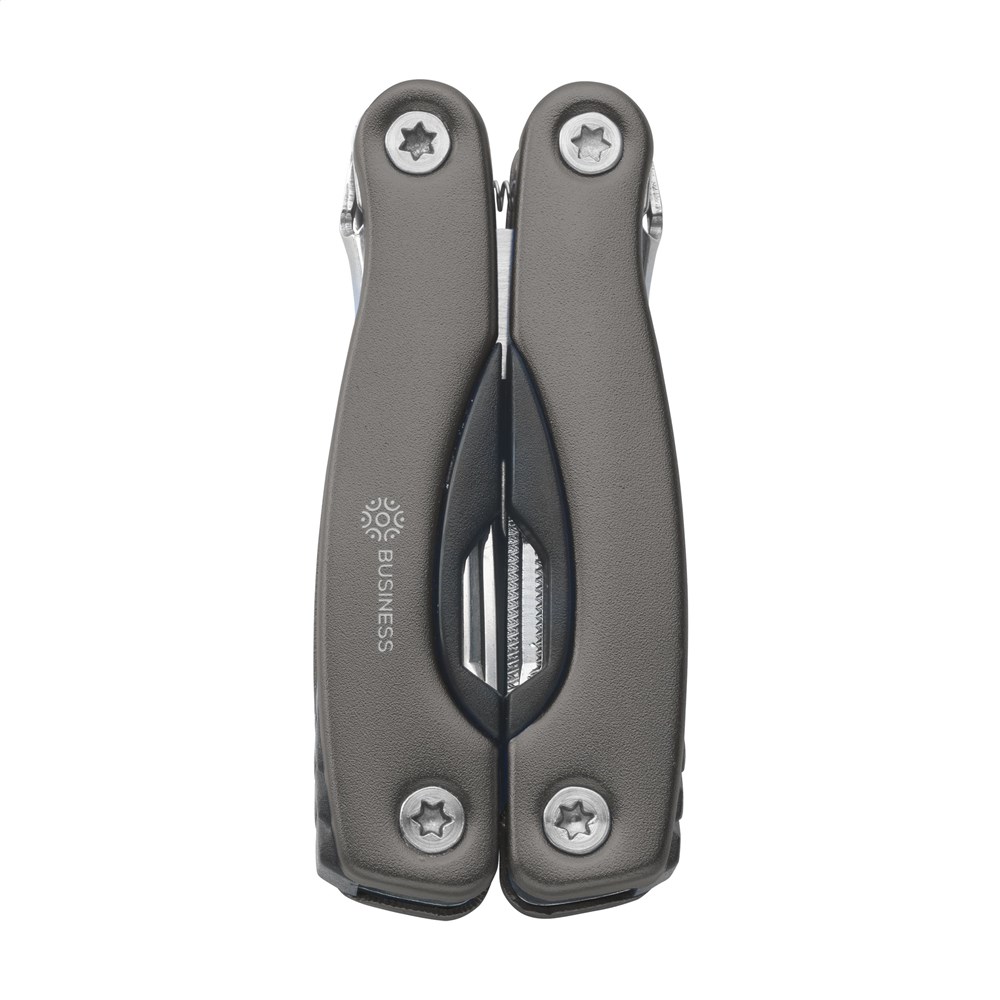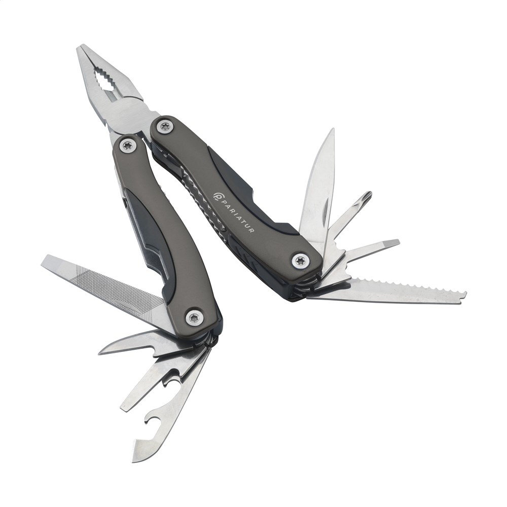 Compacte RVS multitang met aluminium handgreep in metallic look. 9-delig met 13 functies: tang, draadknipper, 3 schroevendraaiers, priem, vijl, blikopener, flesopener, visschraper, visonthaker, mes, philips kruiskopschroevendraaier. Met vergrendeling. In nylon etui. Op het bezit en/of dragen van messen of multitools in het openbaar kunnen lokale regels van toepassing zijn. Per stuk in kraft doos.