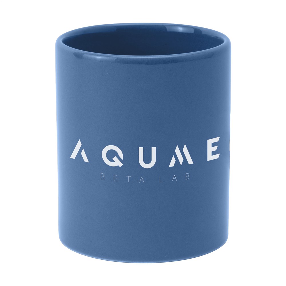 Mok van hoogwaardig keramiek. In geheel wit óf met gekleurde buitenzijde. Vaatwasserbestendig. De opdruk is vaatwasmachine getest en gecertificeerd: EN 12875-2. Inhoud 350 ml.
