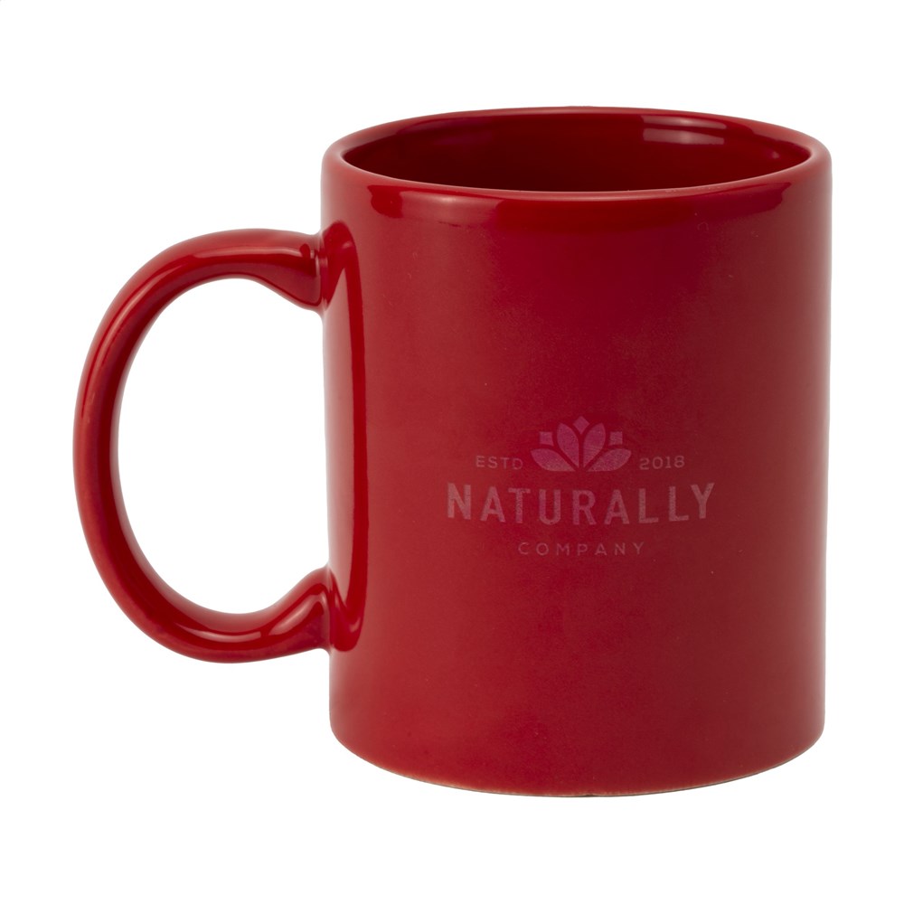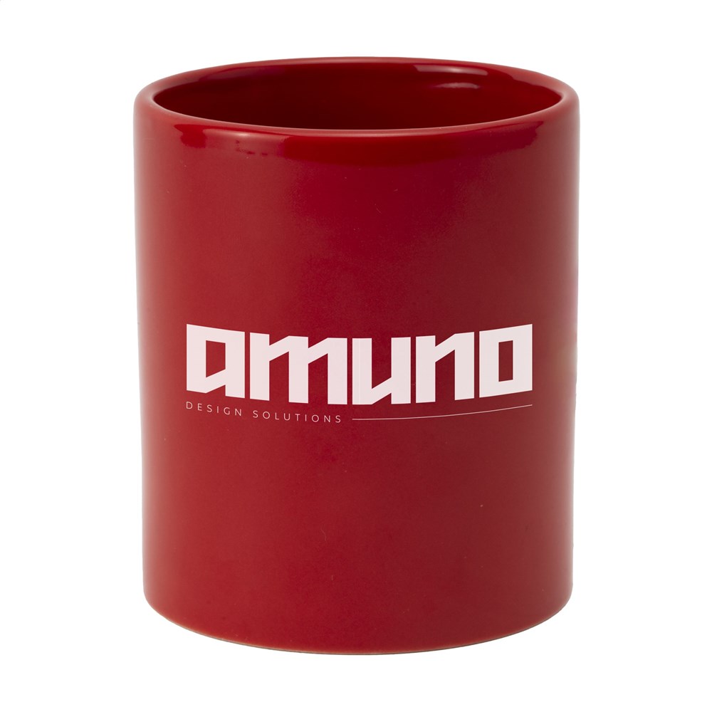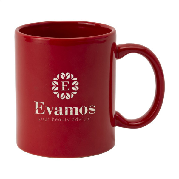 Mok van hoogwaardig keramiek. In geheel wit óf met gekleurde buitenzijde. Vaatwasserbestendig. De opdruk is vaatwasmachine getest en gecertificeerd: EN 12875-2. Inhoud 350 ml.