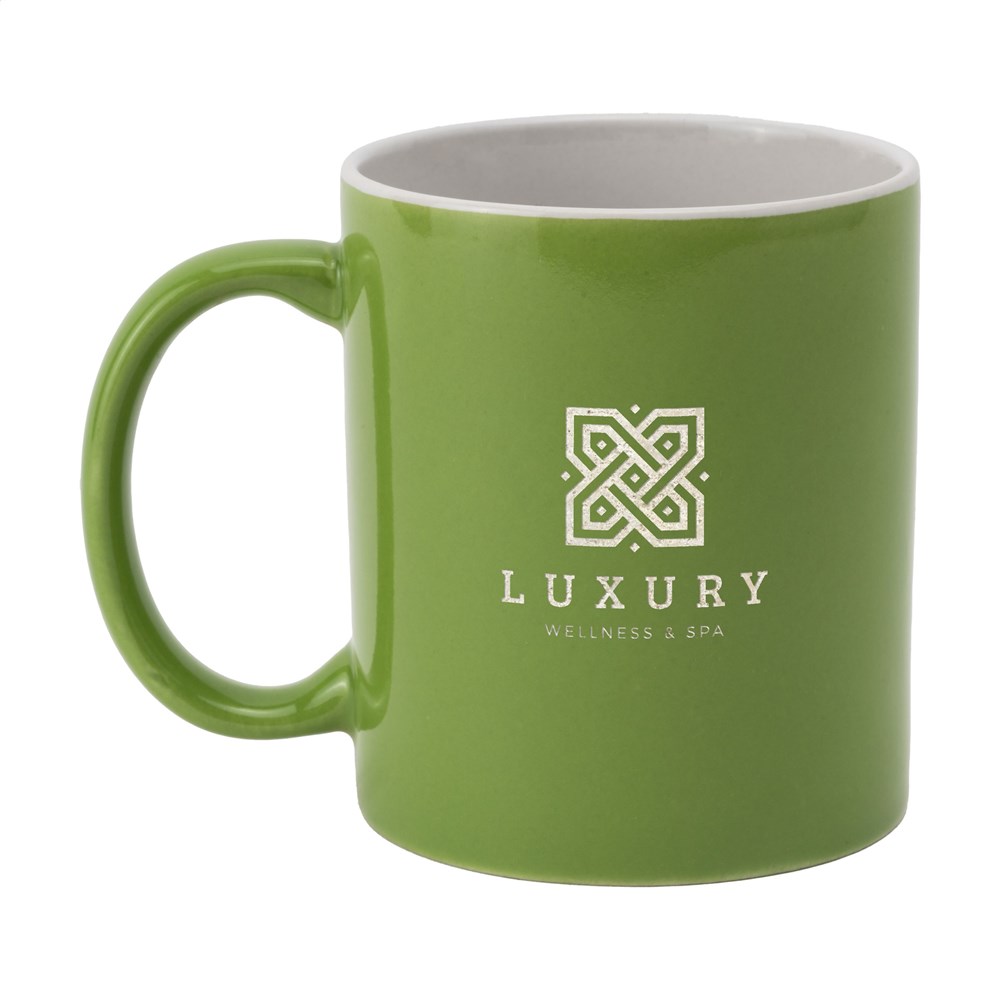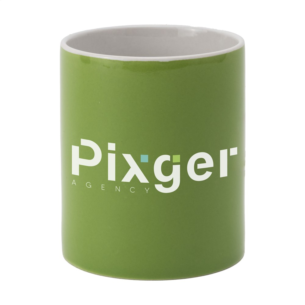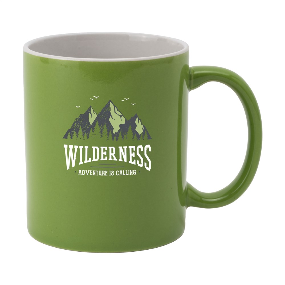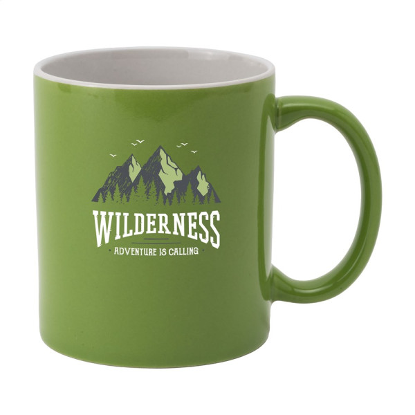 Mok van hoogwaardig keramiek. In geheel wit óf met gekleurde buitenzijde. Vaatwasserbestendig. De opdruk is vaatwasmachine getest en gecertificeerd: EN 12875-2. Inhoud 350 ml.