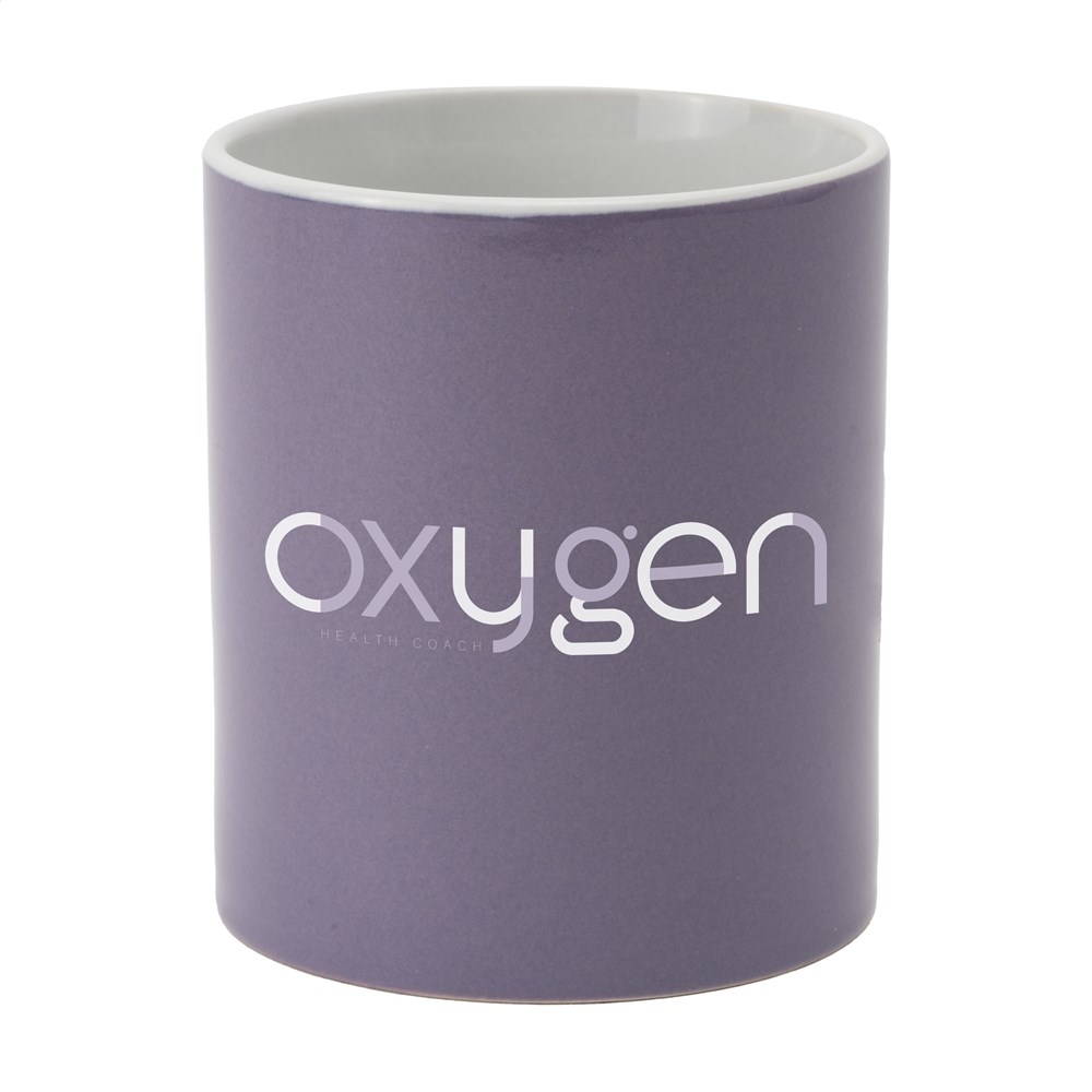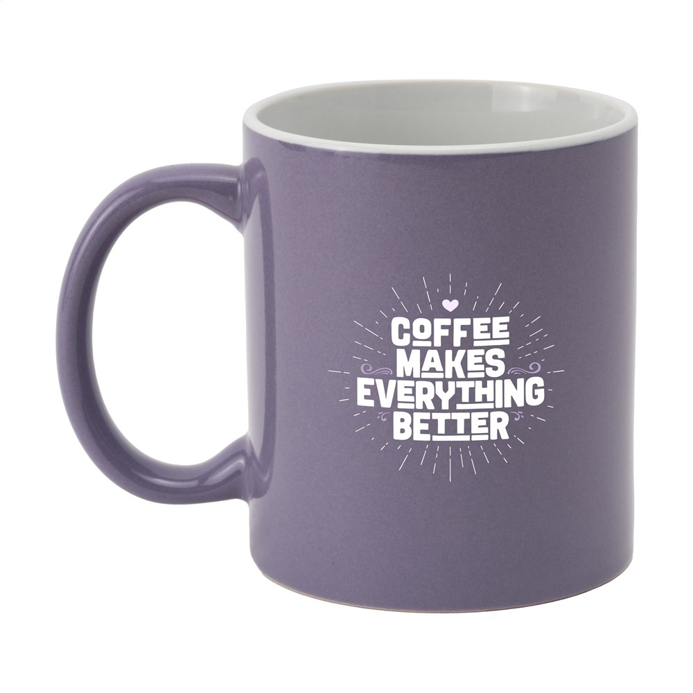 Mok van hoogwaardig keramiek. In geheel wit óf met gekleurde buitenzijde. Vaatwasserbestendig. De opdruk is vaatwasmachine getest en gecertificeerd: EN 12875-2. Inhoud 350 ml.