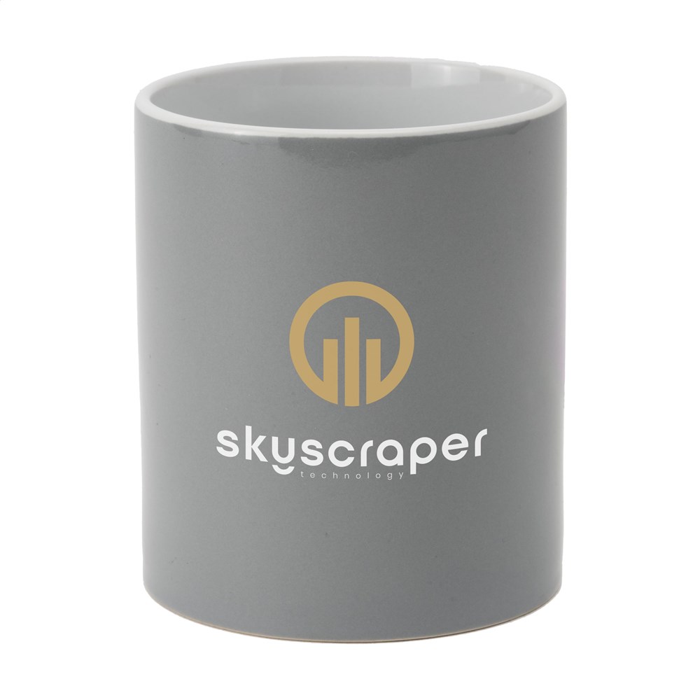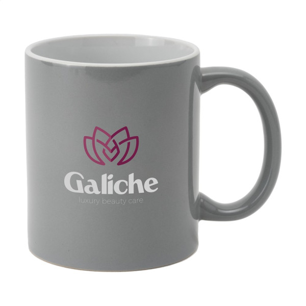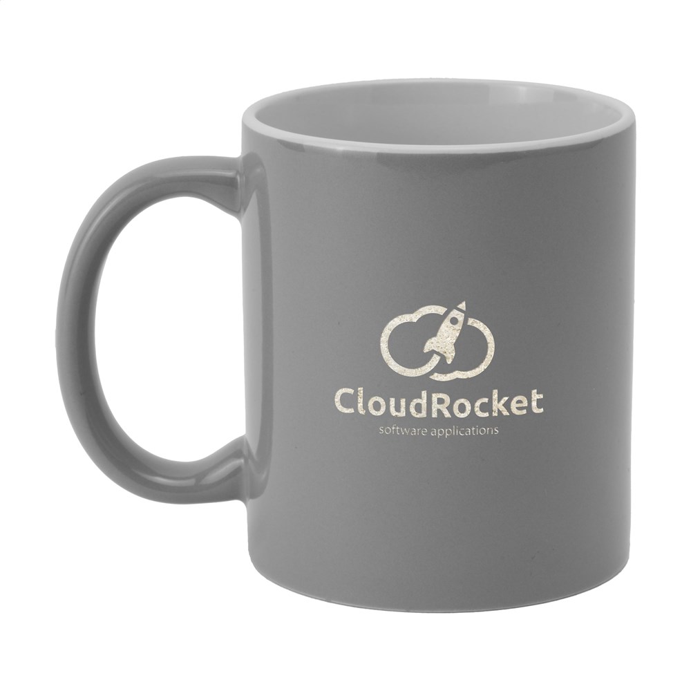 Mok van hoogwaardig keramiek. In geheel wit óf met gekleurde buitenzijde. Vaatwasserbestendig. De opdruk is vaatwasmachine getest en gecertificeerd: EN 12875-2. Inhoud 350 ml.