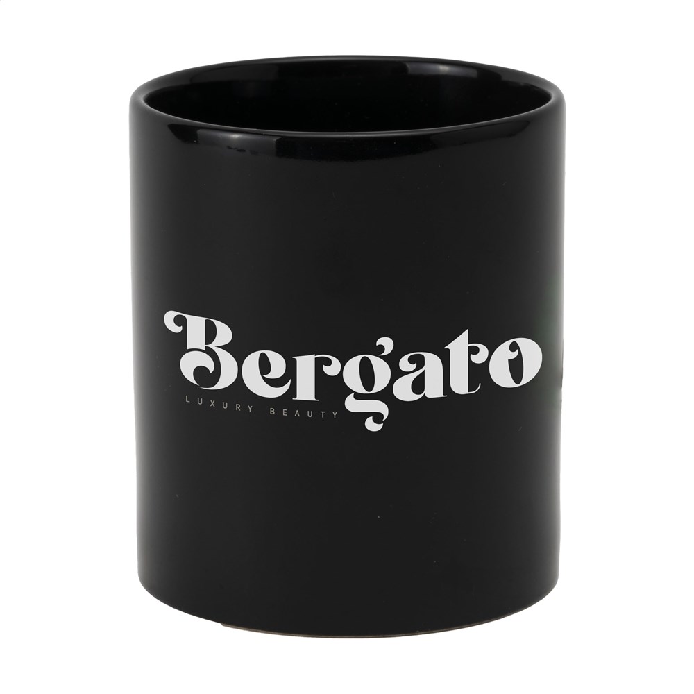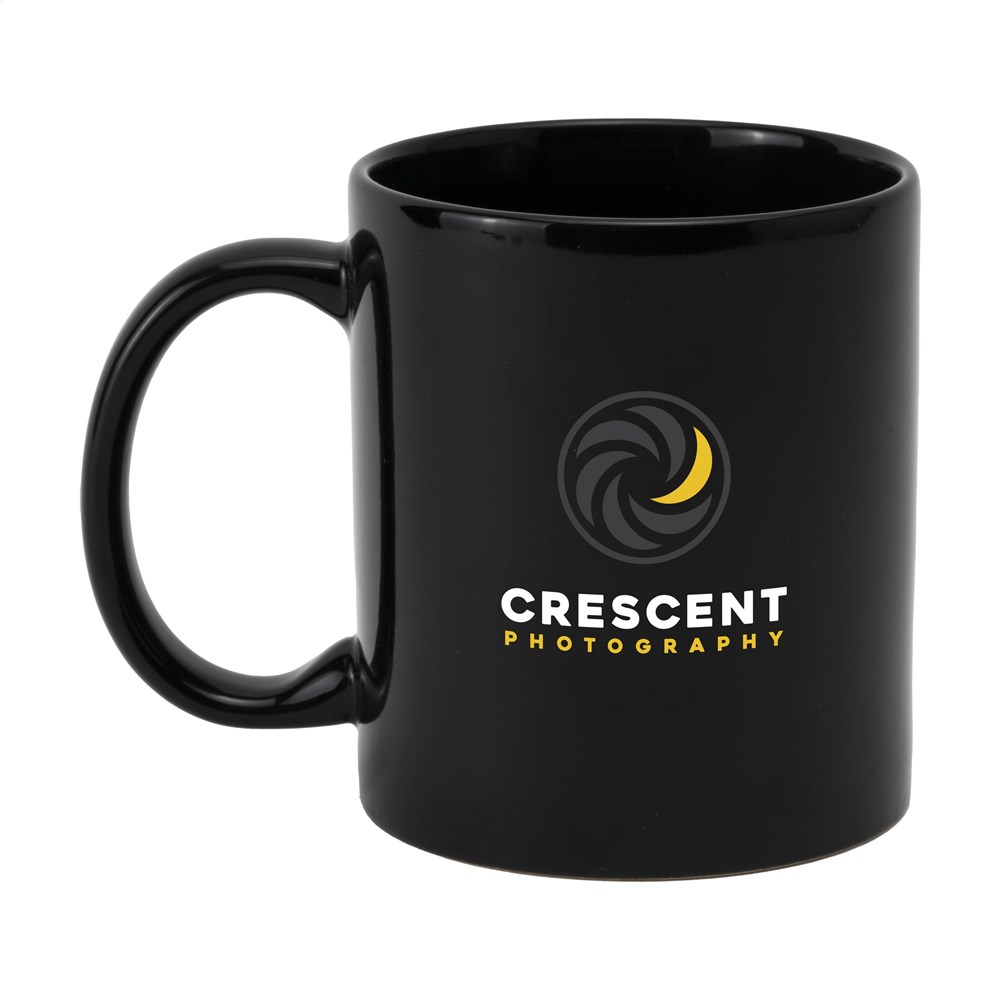 Mok van hoogwaardig keramiek. In geheel wit óf met gekleurde buitenzijde. Vaatwasserbestendig. De opdruk is vaatwasmachine getest en gecertificeerd: EN 12875-2. Inhoud 350 ml.