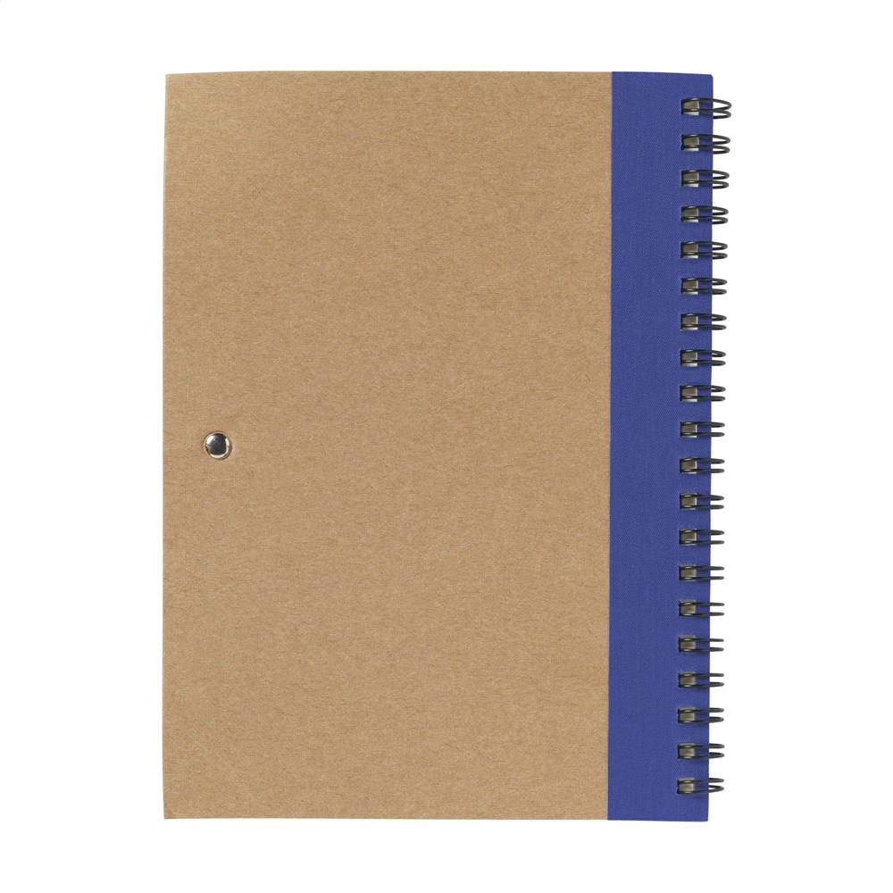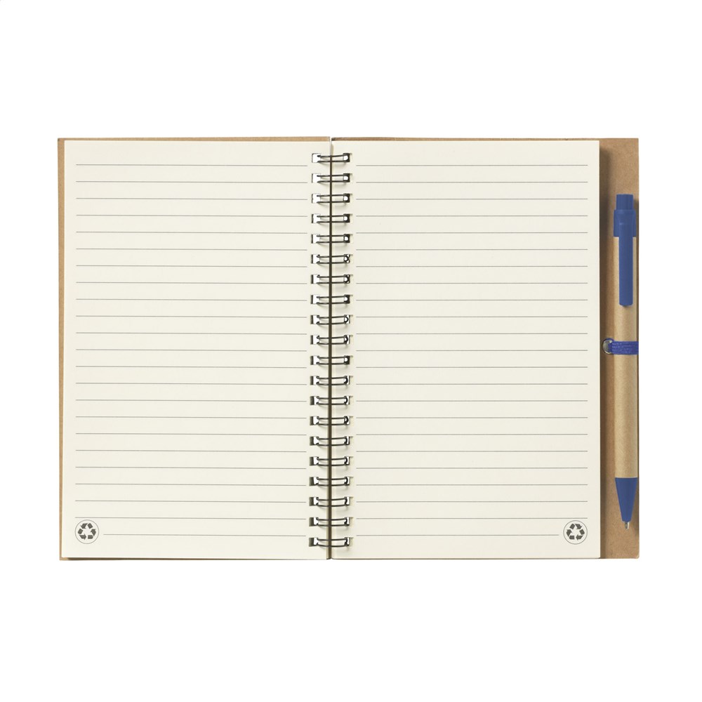 Notitieboekje van gerecycled materiaal met ca. 70 vel/140 pagina's crèmekleurig, gelinieerd papier (70 g/m²) en kartonnen omslag. Gebonden in een sterke, metalen wire-o-binding. Incl. blauwschrijvende balpen. FSC Mix gecertificeerd.