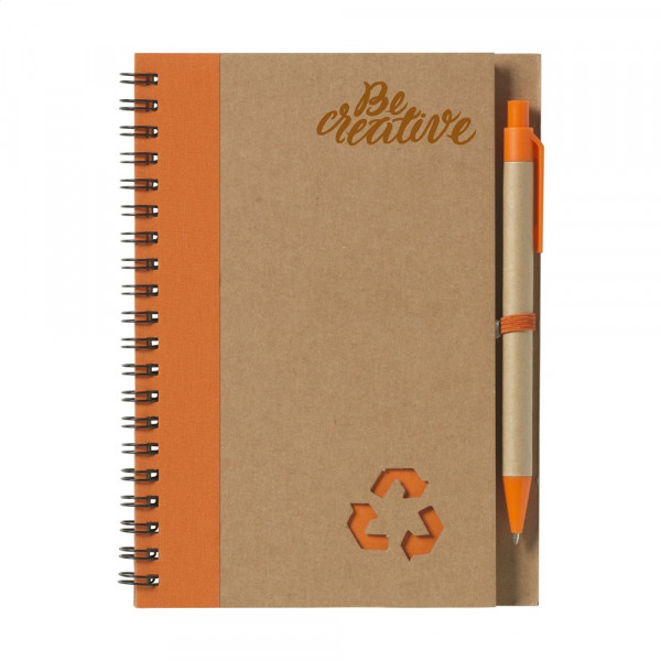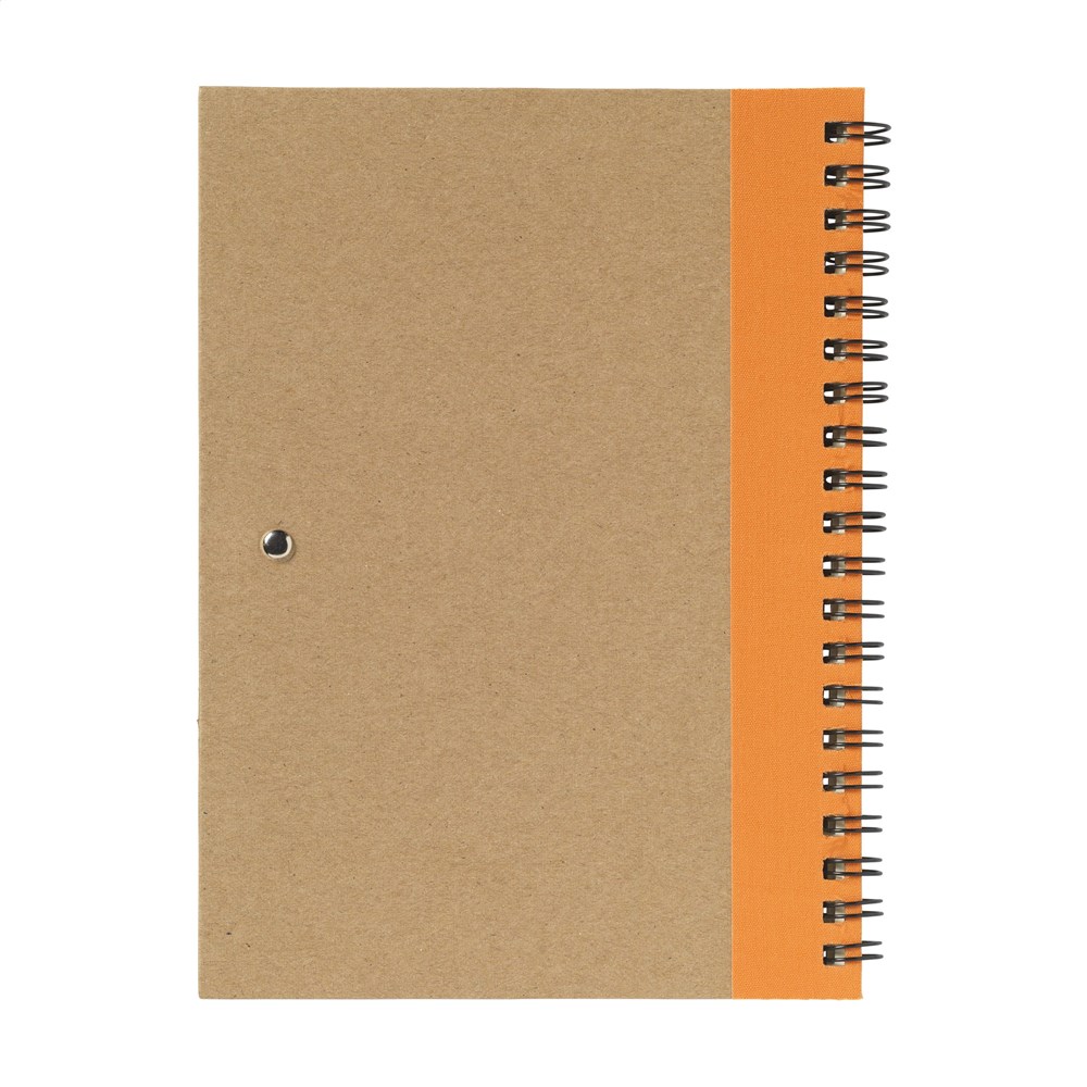 Notitieboekje van gerecycled materiaal met ca. 70 vel/140 pagina's crèmekleurig, gelinieerd papier (70 g/m²) en kartonnen omslag. Gebonden in een sterke, metalen wire-o-binding. Incl. blauwschrijvende balpen. FSC Mix gecertificeerd.