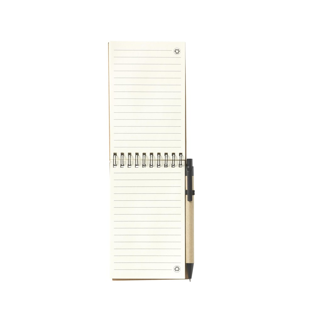 Notitieboekje van gerecycled materiaal, met ca. 70 vel/140 pagina's crèmekleurig, gelinieerd papier (70 g/m²) en kartonnen omslag met elastische sluiting. Gebonden in een sterke, metalen wire-o-binding. Incl. blauwschrijvende balpen. FSC Mix gecertificeerd.