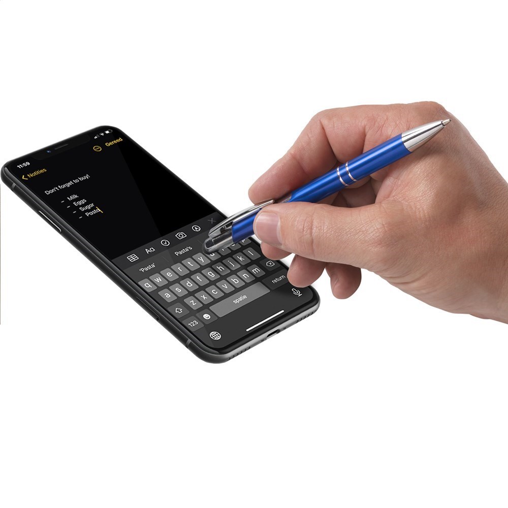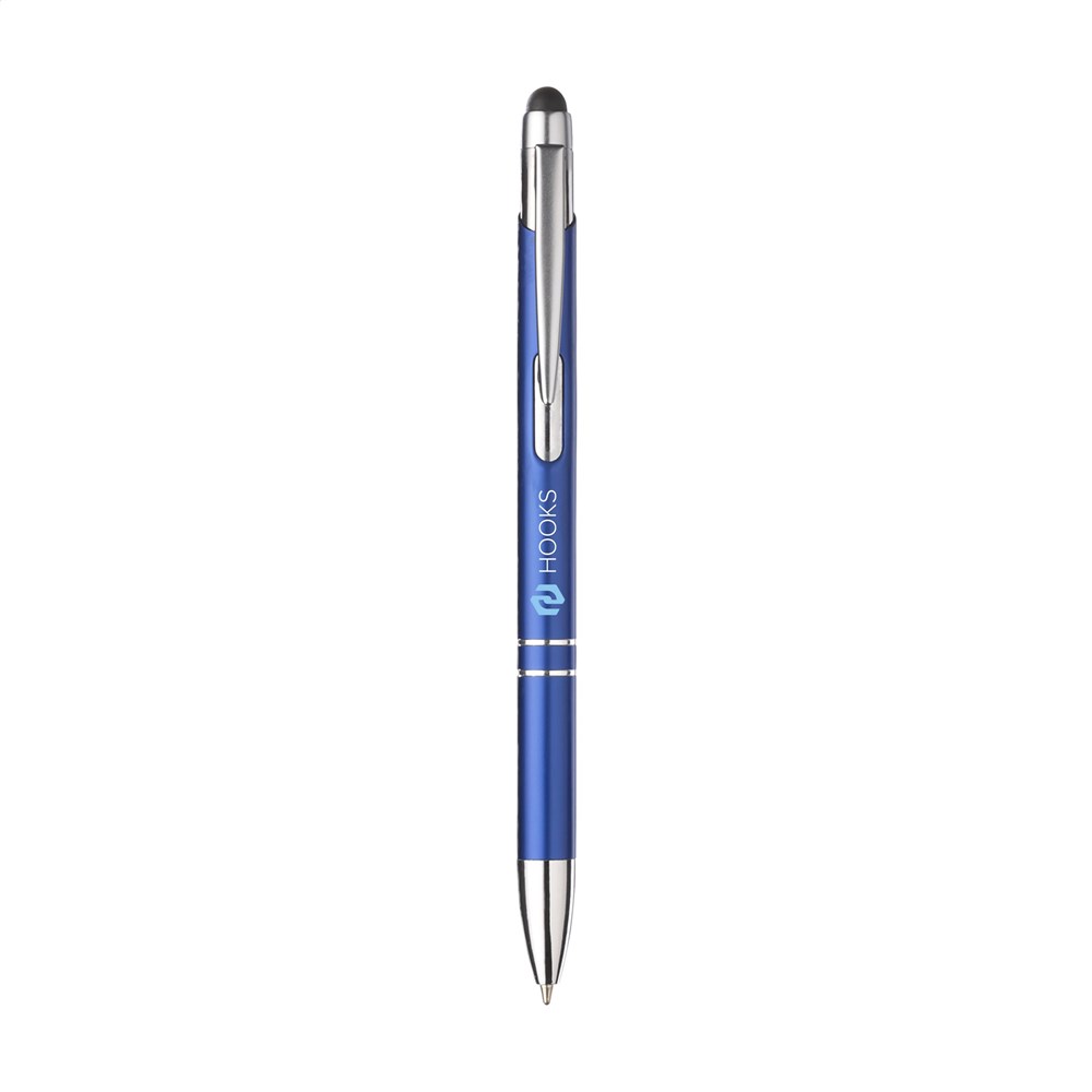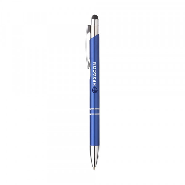Blauwschrijvende, aluminium balpen. Met top/pointer voor het bedienen van touchscreens (zoals...meer