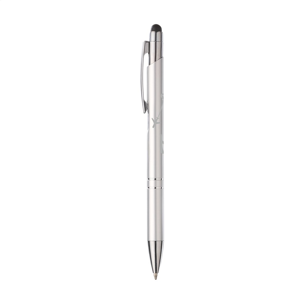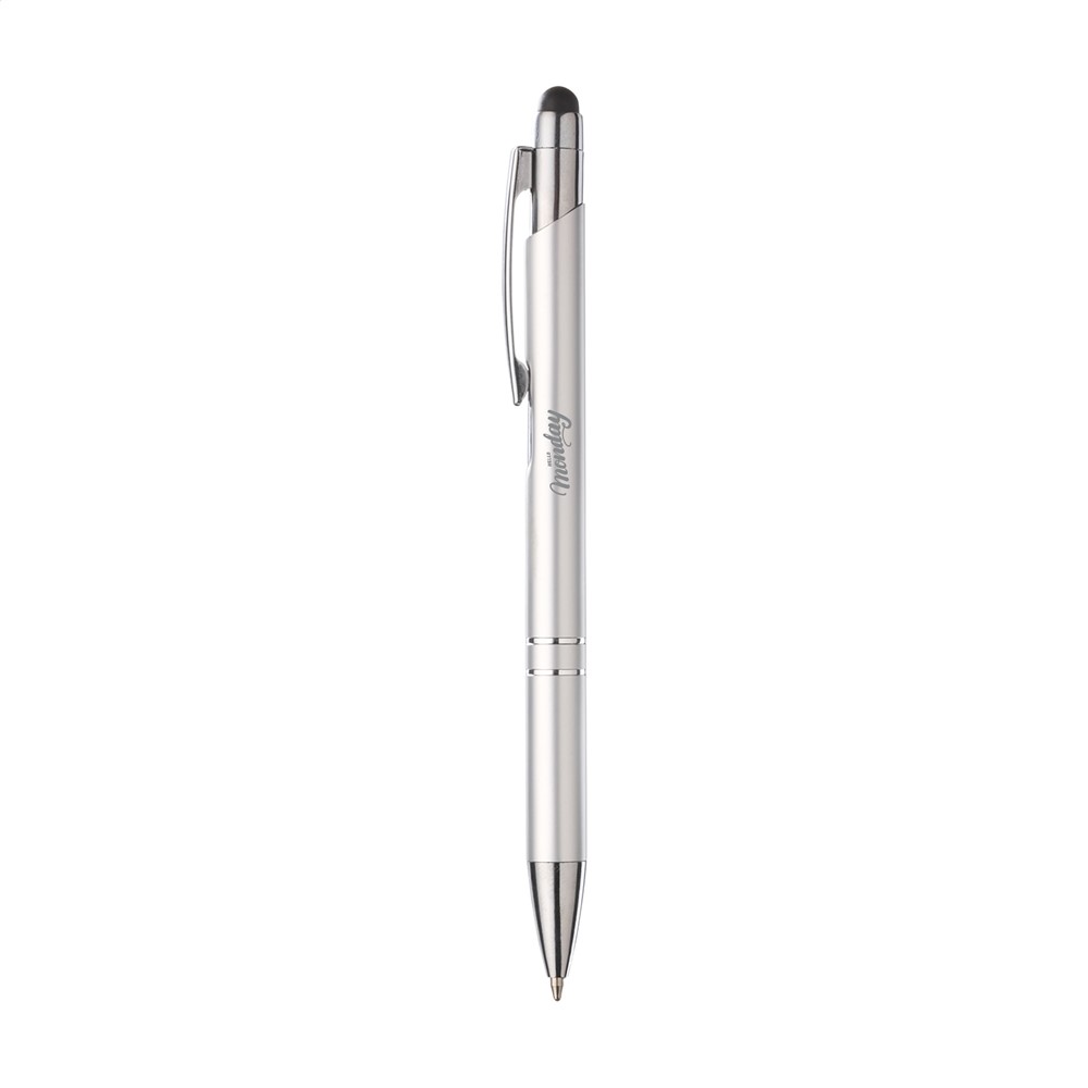 Blauwschrijvende, aluminium balpen. Met top/pointer voor het bedienen van touchscreens (zoals iPhone/iPad), matgekleurde, metalic look houder en metalen clip/drukknop.