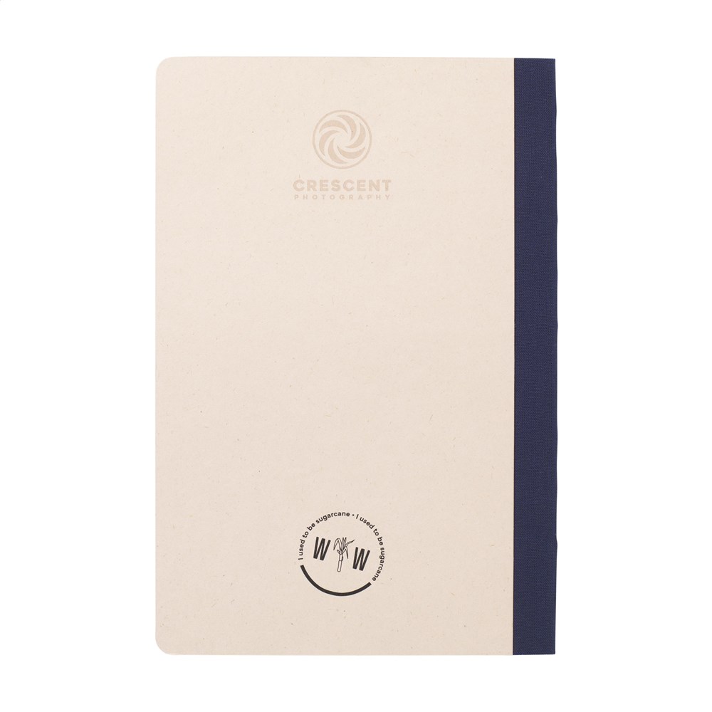 Exclusief notitieboek in A5-formaat, gemaakt van het gerecycled afval van de suikerrietplant. Met hardcover en 80 vel/160 pagina's gelinieerd papier (100 g/m²). De hardcover en het papier zijn FSC Mix gecertificeerd. Het papier, waarin kleine vezels zichtbaar zijn, heeft een mooie lichtbruine kleur. Dit benadrukt het gebruik van natuurlijke materialen. Na de oogst van de suikerrietplant blijven de wortels van de plant in de grond en worden de stengels en bladeren verwerkt tot een residu dat gebruikt wordt voor het maken van papier. Een suikerrietplant haalt tijdens de groei CO2 uit de lucht en kan wel tot 10 jaar oud worden