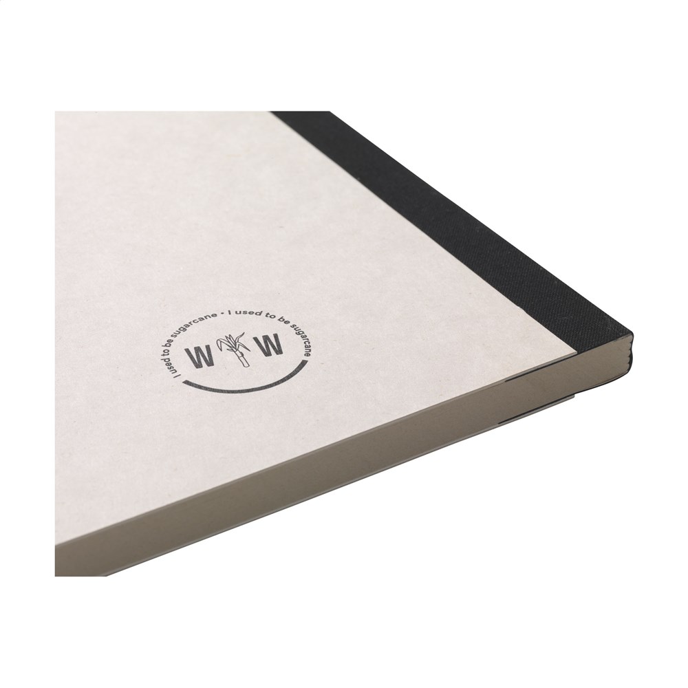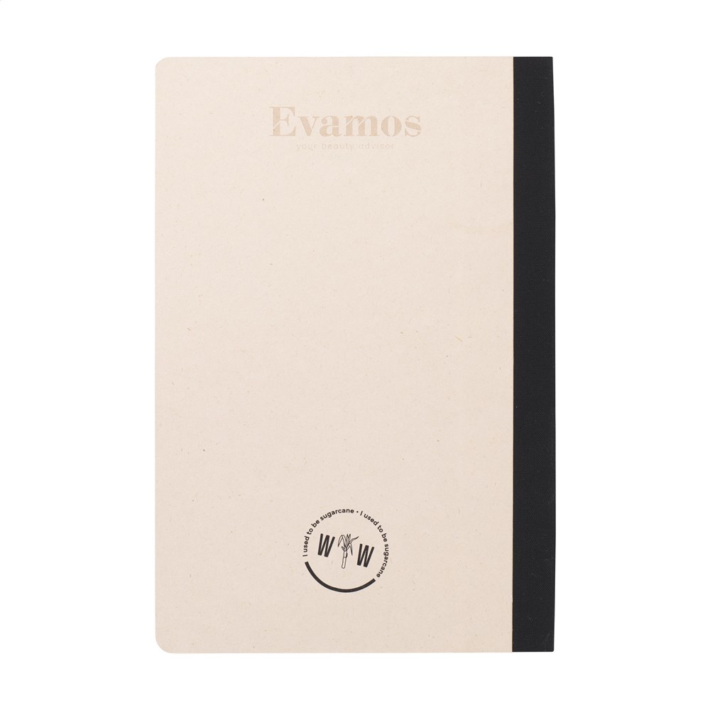 Exclusief notitieboek in A5-formaat, gemaakt van het gerecycled afval van de suikerrietplant. Met hardcover en 80 vel/160 pagina's gelinieerd papier (100 g/m²). De hardcover en het papier zijn FSC Mix gecertificeerd. Het papier, waarin kleine vezels zichtbaar zijn, heeft een mooie lichtbruine kleur. Dit benadrukt het gebruik van natuurlijke materialen. Na de oogst van de suikerrietplant blijven de wortels van de plant in de grond en worden de stengels en bladeren verwerkt tot een residu dat gebruikt wordt voor het maken van papier. Een suikerrietplant haalt tijdens de groei CO2 uit de lucht en kan wel tot 10 jaar oud worden