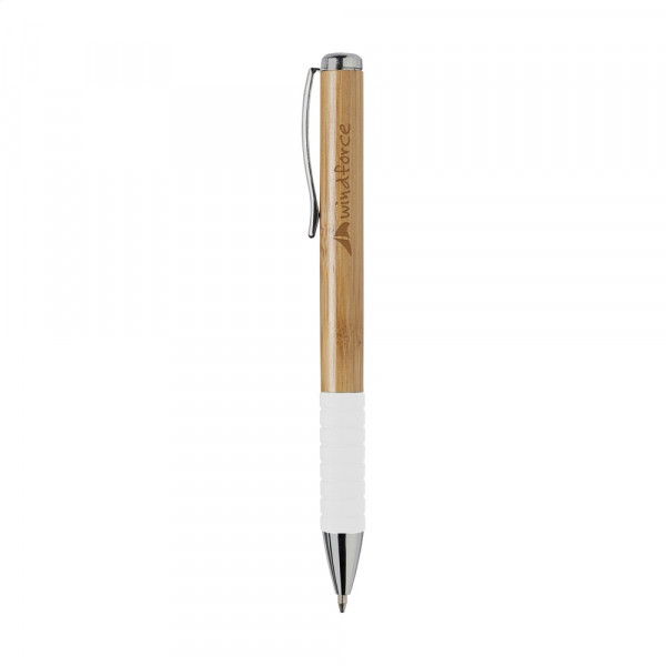 Blauwschrijvende balpen met bamboe houder, metalen clip, draaikliksysteem en gekleurd rubberen, gripvast voorstuk.