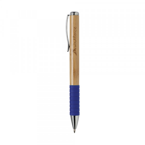 Blauwschrijvende balpen met bamboe houder, metalen clip, draaikliksysteem en gekleurd rubberen, gripvast voorstuk.