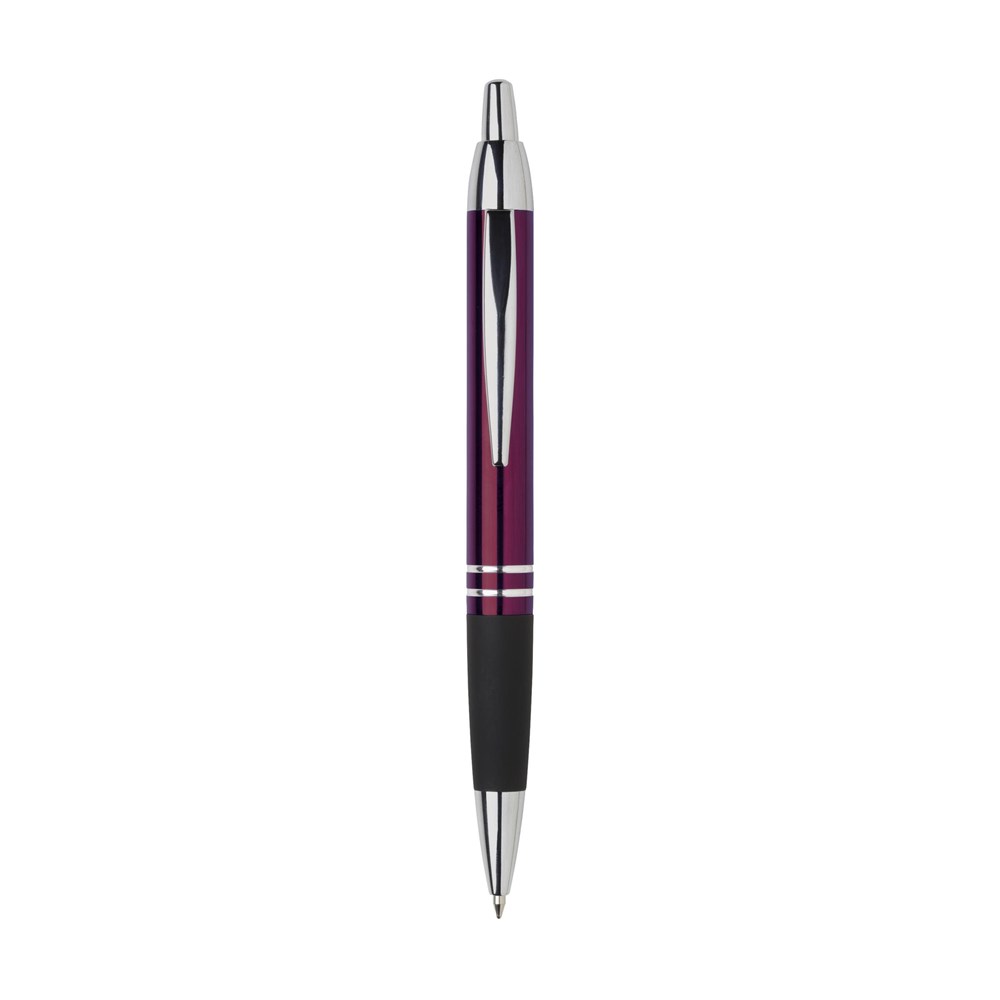 Blauwschrijvende, metalen balpen met hoogglans metallic look houder, gripvast, rubberen voorstuk, stevige, metalen clip en drukknop en zilverkleurige hoogglans accenten.