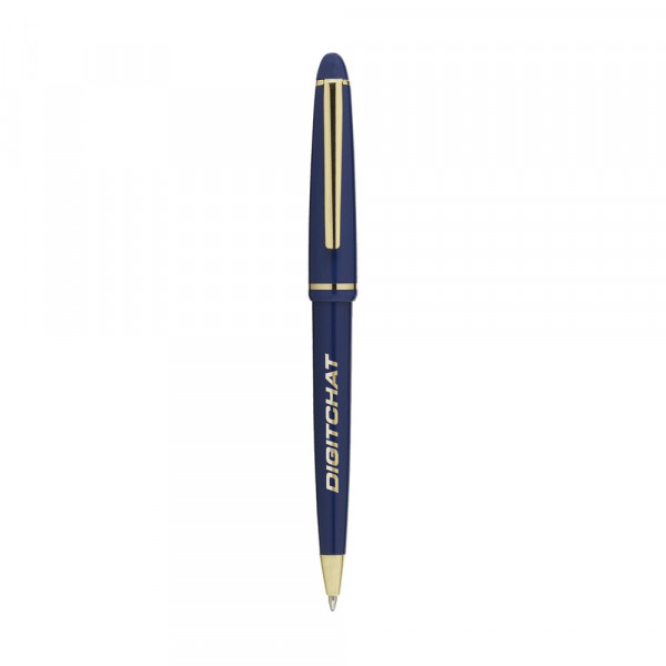 Blauwschrijvende balpen met gepolijste houder, vergulde, sierlijke clip en puntstuk en schuifkapdruksysteem.
