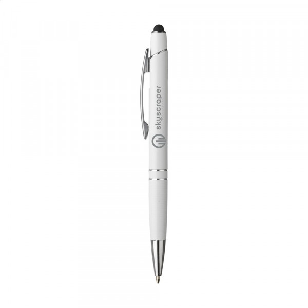 Blauwschrijvende pen met aluminium houder met gripvast voorstuk, zilverkleurige accenten en metalen clip. Voorzien van een top/pointer voor het bedienen van touchscreens (zoals iPhone/iPad).