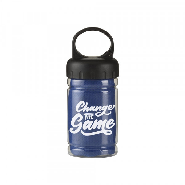 Speciale koelhanddoek van 100% polyester. Na een dompeling in koud water biedt deze handdoek verkoeling tijdens sportieve activiteiten of bij zonverbranding. Ideaal formaat (afm. 30 x 80 cm) om te dragen als nekkoeler. In transparante koker met ABS schroefdeksel met karabijnhaak.