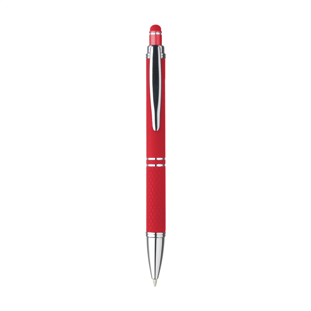Blauwschrijvende, aluminium balpen met rubberen top/pointer voor het bedienen van touchscreens (zoals iPhone/iPad). De houder is afgewerkt met een mooie rubberised soft touch finish. In het voorstuk is een speels reliëf aangebracht dat voor een vaste grip zorgt. Door de aandacht voor veel kleine extra details is het ontwerp van deze pen opvallend aantrekkelijk.