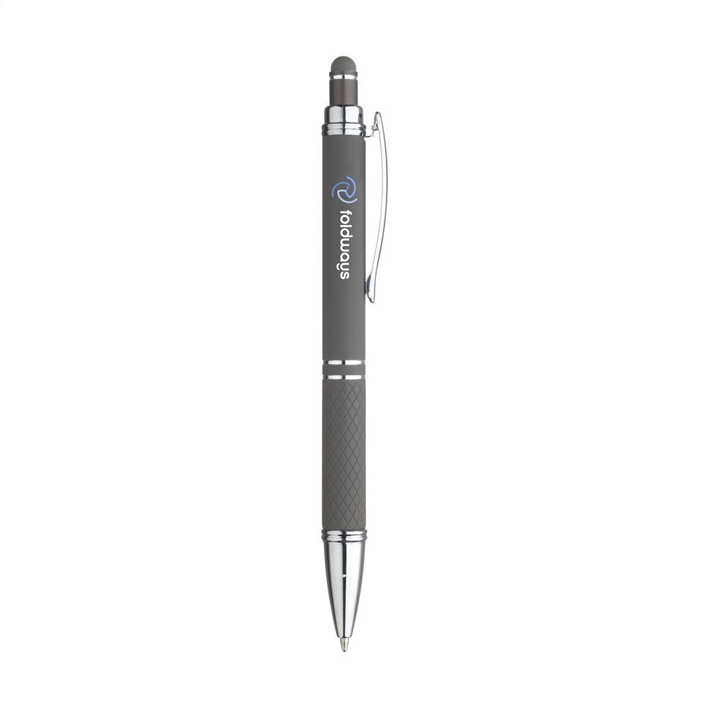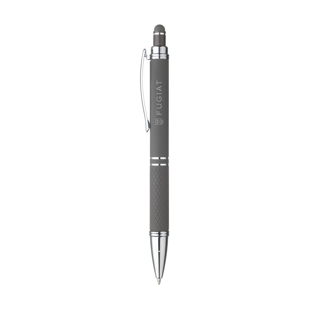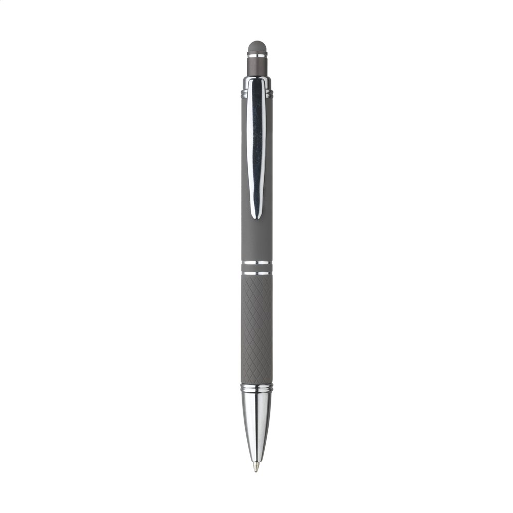 Blauwschrijvende, aluminium balpen met rubberen top/pointer voor het bedienen van touchscreens (zoals iPhone/iPad). De houder is afgewerkt met een mooie rubberised soft touch finish. In het voorstuk is een speels reliëf aangebracht dat voor een vaste grip zorgt. Door de aandacht voor veel kleine extra details is het ontwerp van deze pen opvallend aantrekkelijk.