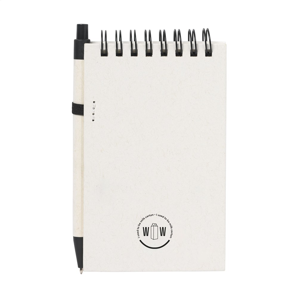 A6-notitieboekje waarvan zowel de cover als het papier gemaakt is van het overgebleven papier van gerecyclede melkpakken (tot 70%) en 30% gerecycled papier. Het notitieboekje is ringgebonden en heeft ca. 70 vel/140 pagina's crèmekleurig, gerecycled, gelinieerd papier (80 g/m²). Het wordt geleverd inclusief een bijpassende blauwschrijvende balpen, gemaakt van gerecyclede melkpakken. Door het gebruik van gerecycelde materialen kunnen kleine oneffenheden in het materiaal zichtbaar zijn. Dit geeft het product een unieke uitstraling.