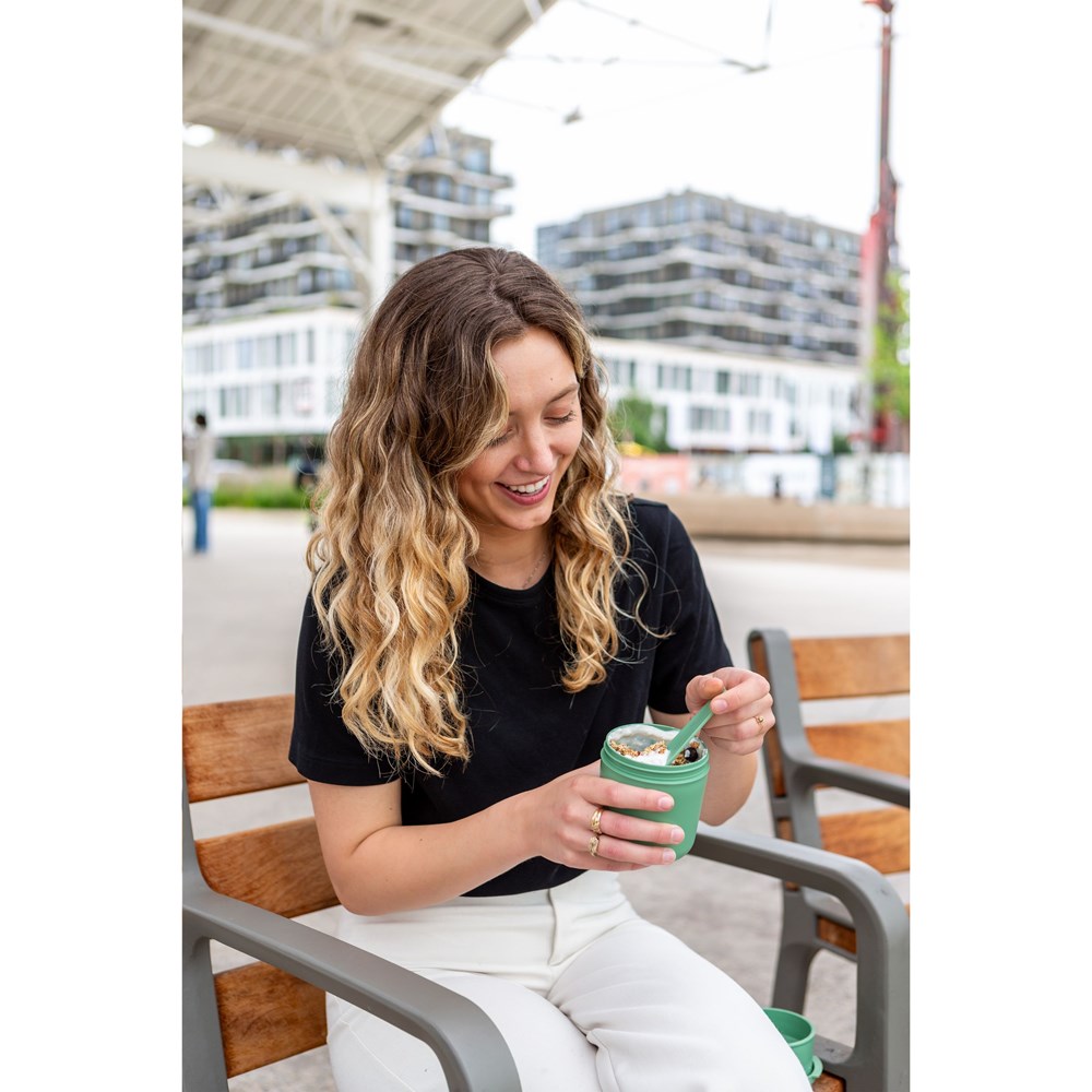Foodjar van PP kunststof van het merk Amuse. Met één draaibeweging scheid je de twee compartimenten van elkaar. Het bovenste compartiment is af te sluiten met een lekvrije, transparante Tritan deksel en heeft een inhoud van ca. 150 ml voor fruit of muesli. Het onderste compartiment is met een inhoud van 450 ml groot genoeg voor een flinke portie yoghurt of kwark. Deze foodjar is ideaal voor het bewaren of meenemen van een lunch of tussendoortje en wordt geleverd met een kunststof vork en lepel in één en een elastiek. Geschikt voor de magnetron (zonder deksel), diepvries en vaatwasser tot 65°C. Voor behoud van de opdruk wordt met de hand afwassen aanbevolen. Inhoud 600 ml. Made in Belgium. Optioneel: Per stuk in kraft doos.