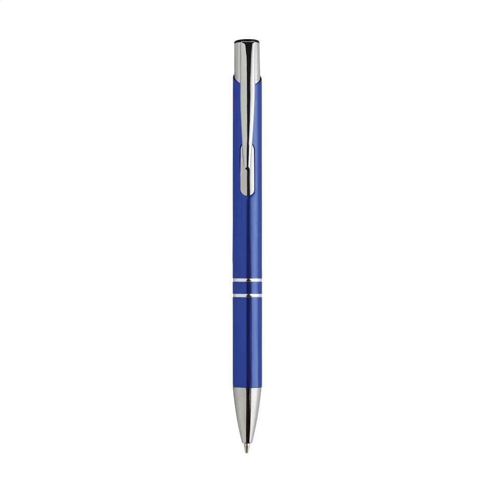 Blauwschrijvende, aluminium balpen met glanzende, metallic look houder en metalen clip.meer