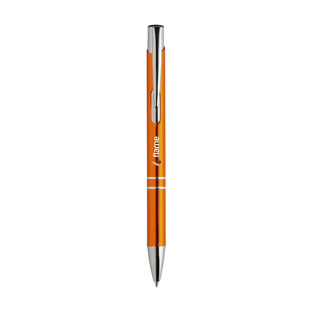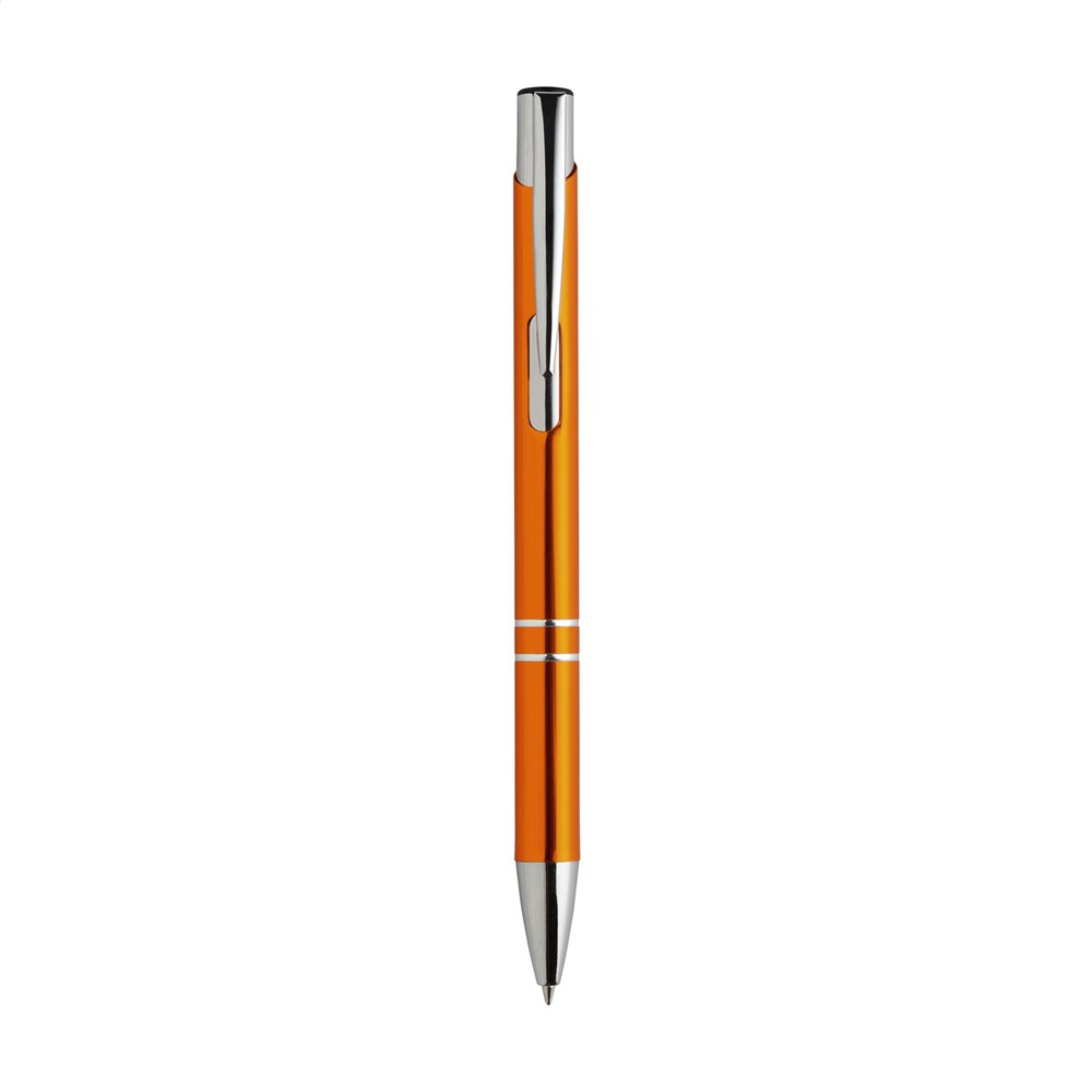 Blauwschrijvende, aluminium balpen met glanzende, metallic look houder en metalen clip.meer