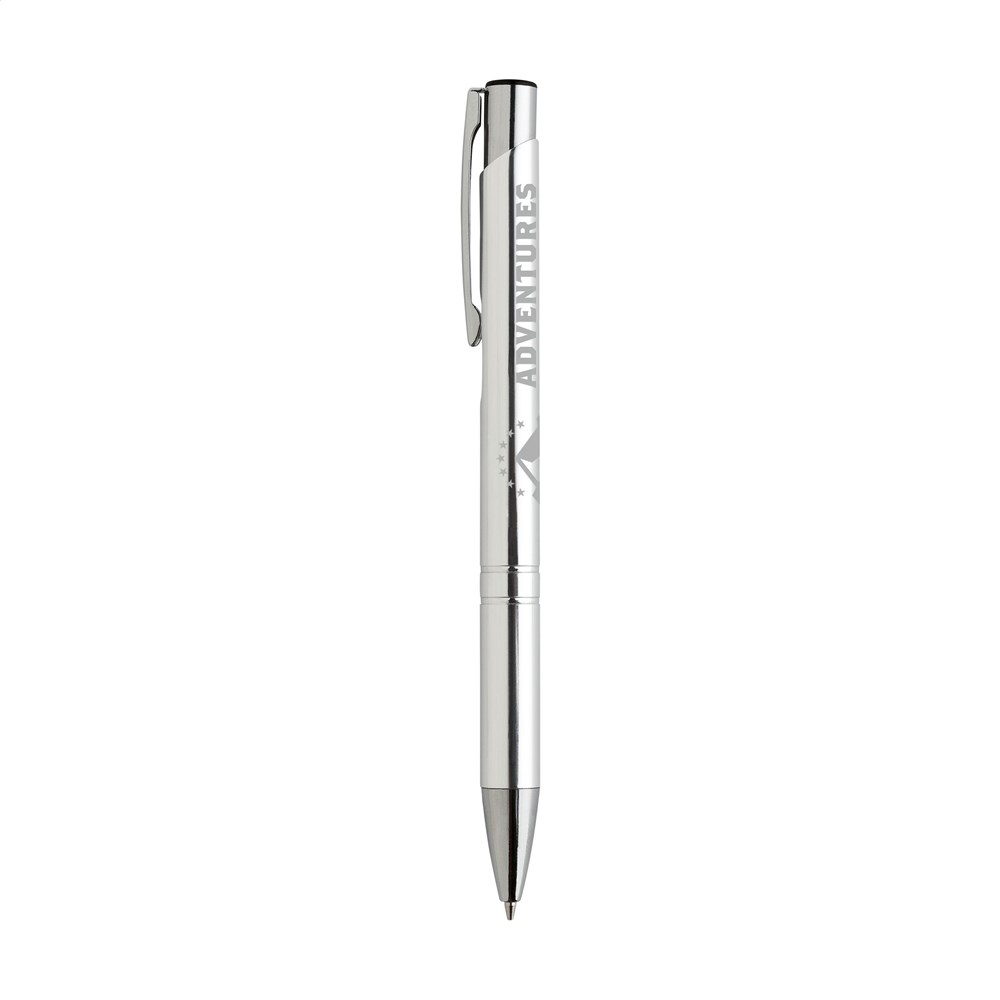Blauwschrijvende, aluminium balpen met glanzende, metallic look houder en metalen clip.