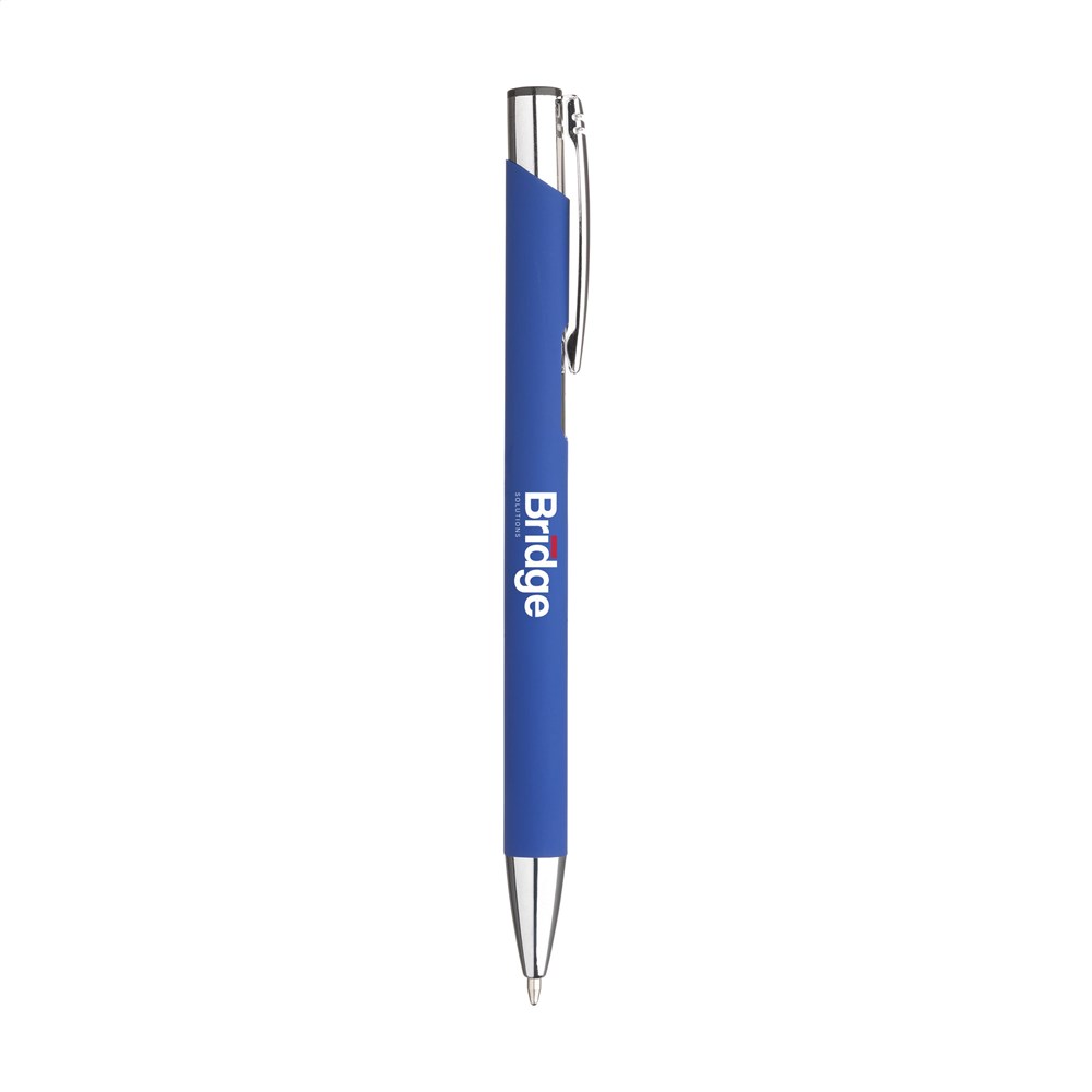Blauwschrijvende, aluminium balpen met metalen clip. De houder is afgewerkt met een mooie rubberised finish. Doordat de houder uit één geheel bestaat heeft deze pen ruimte voor een grote opdruk.