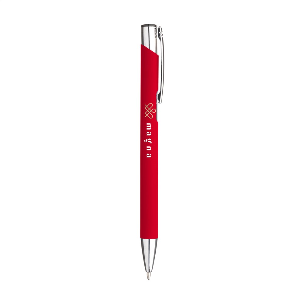 Blauwschrijvende, aluminium balpen met metalen clip. De houder is afgewerkt met een mooie rubberised finish. Doordat de houder uit één geheel bestaat heeft deze pen ruimte voor een grote opdruk.