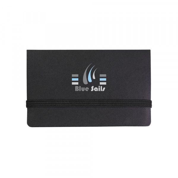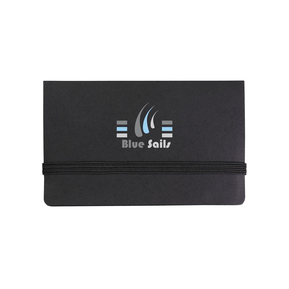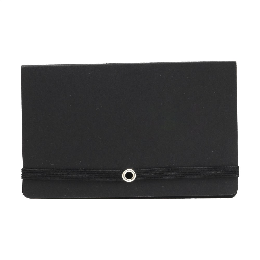 Notitieboekje met 25 zelfklevende memovelletjes, 125 beschrijfbare markeerstickers, visitekaarthouder en elastische sluiting.