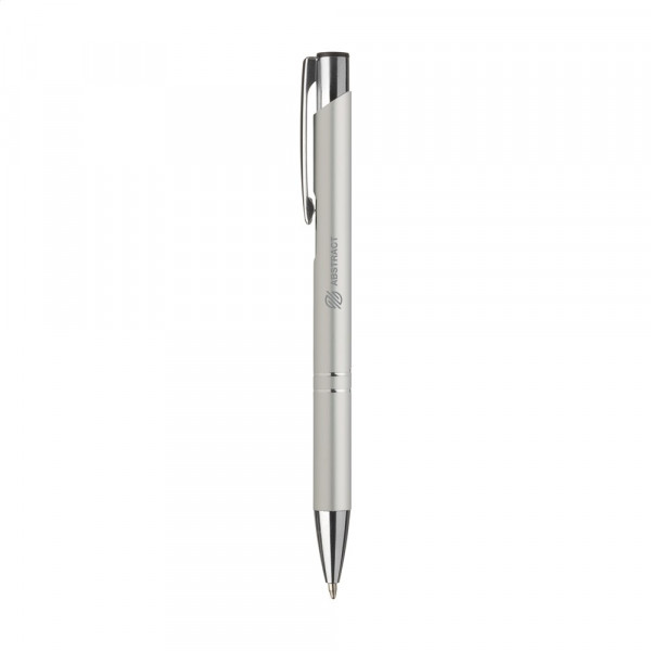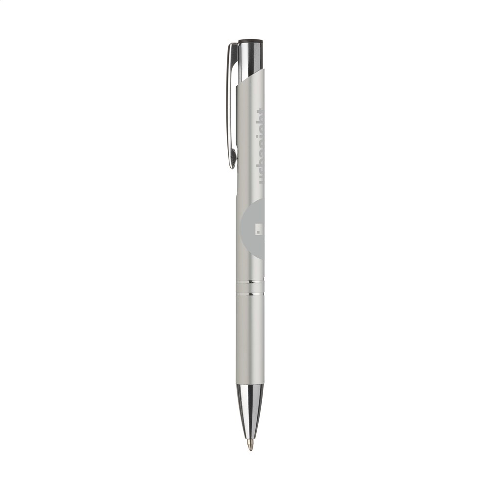 Blauwschrijvende óf zwartschrijvende, aluminium balpen met matgekleurde houder in metallic look en metalen clip.