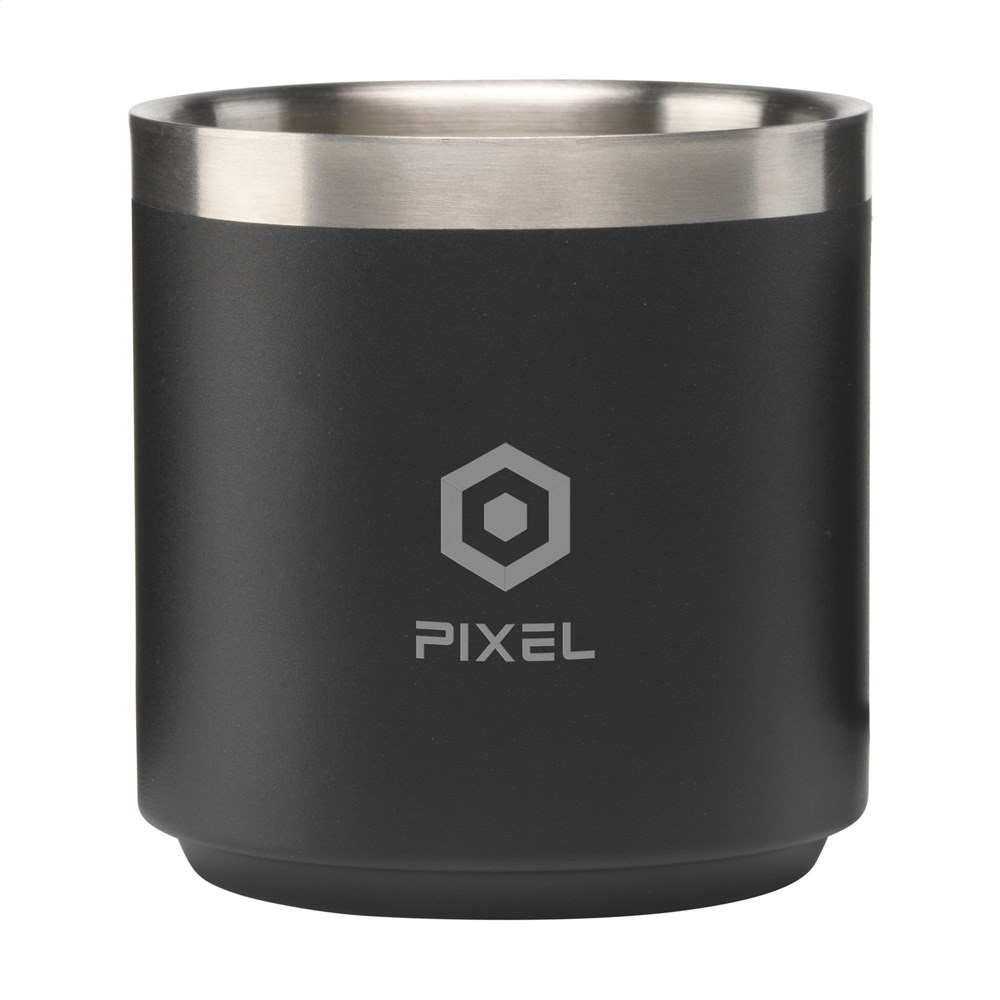 Dubbelwandige, stapelbare mok. De binnen- en buitenwand zijn gemaakt van gerecycled RVS. Hierdoor blijft warme drank langere tijd op temperatuur. Afgewerkt met een mooie poedercoating. RCS-gecertificeerd. Totaal gerecycled materiaal: 87%. Inhoud 300 ml. RVS kan vele malen gerecycled worden terwijl de kwaliteit van het materiaal grotendeels behouden blijft. Door het gebruik van gerecycled RVS worden minder nieuwe grondstoffen gebruikt. Dit betekent minder energieverbruik en minder gebruik van water. Per stuk verpakt.