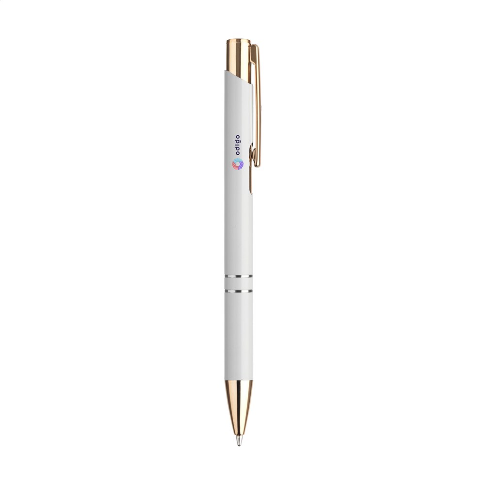 Blauwschrijvende balpen van gerecycled aluminium met een stevige, roségouden clip/drukknop van gerecycled aluminium. De pen heeft elegante roségouden en zilverkleurige accenten en is daarmee een opvallend chique verschijning. RCS-gecertificeerd. Totaal gerecycled materiaal: 94%. Door het gebruik van gerecycled aluminium worden er minder nieuwe grondstoffen gebruikt tijdens de productie van dit product. Dit betekent minder energieverbruik en minder gebruik van water.
