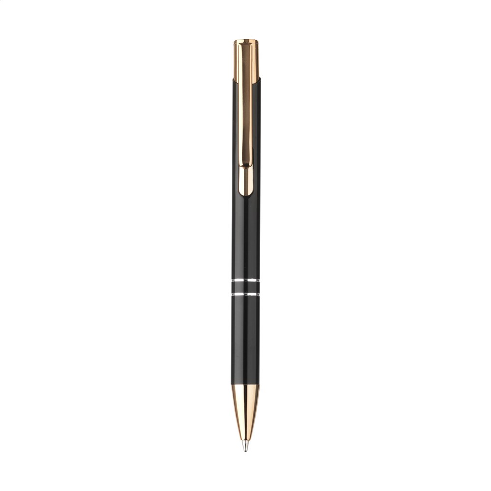 Blauwschrijvende balpen van gerecycled aluminium met een stevige, roségouden clip/drukknop van gerecycled aluminium. De pen heeft elegante roségouden en zilverkleurige accenten en is daarmee een opvallend chique verschijning. RCS-gecertificeerd. Totaal gerecycled materiaal: 94%. Door het gebruik van gerecycled aluminium worden er minder nieuwe grondstoffen gebruikt tijdens de productie van dit product. Dit betekent minder energieverbruik en minder gebruik van water.