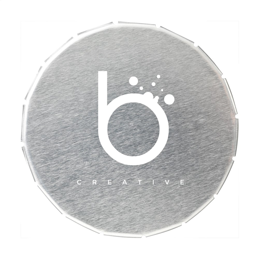 Uitdeelblikje met handig druk-/kliksysteem. Gevuld met ca. 12 g snoepjes.