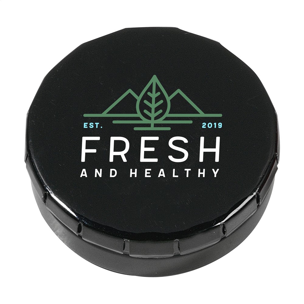 Uitdeelblikje met handig druk-/kliksysteem. Gevuld met ca. 12 g snoepjes.