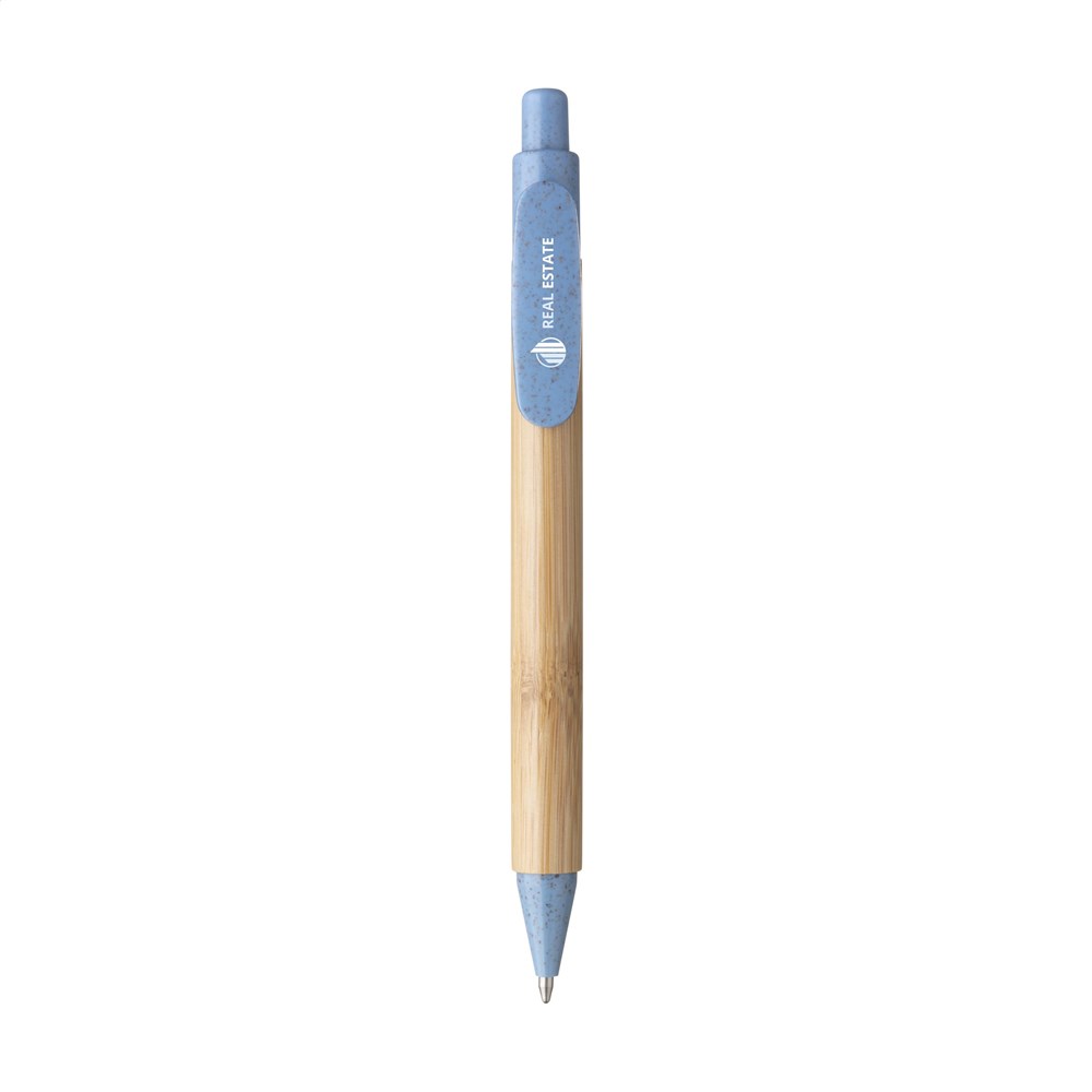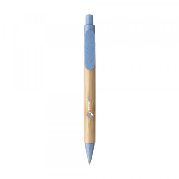 Blauwschrijvende balpen met bamboe houder. De clip, drukknop en het puntstuk zijn van tarwestro/PP kunststof.