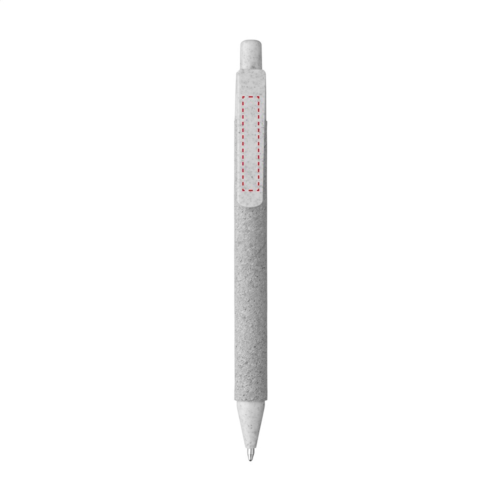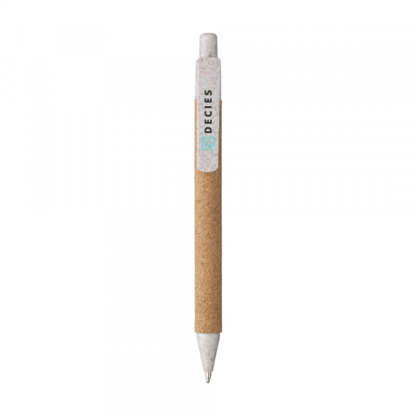 Blauwschrijvende balpen met houder van kurk. Het puntstuk, de top, drukknop en clip zijn gemaakt van 50% PP en 50% tarwestro. Gedeeltelijk biologisch afbreekbaar.