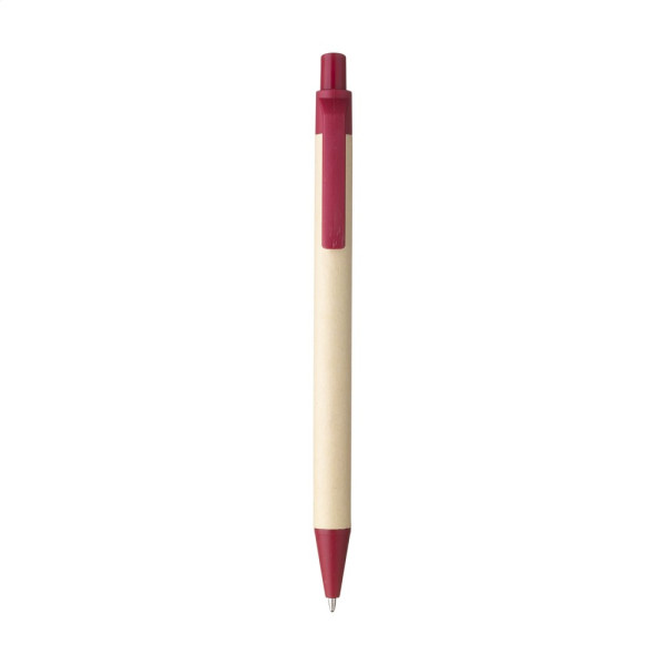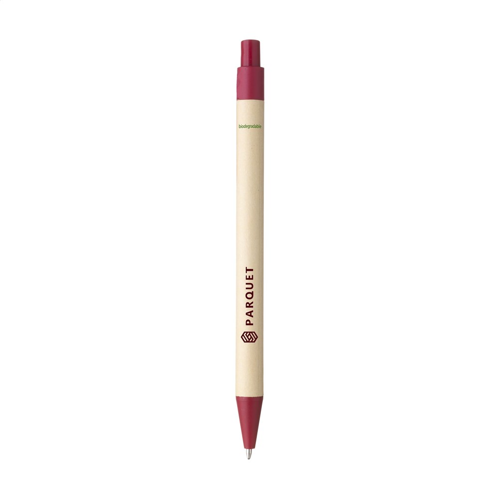 Balpen met houder van gerecycled papier. De gekleurde clip, drukknop en het puntstuk zijn van biologisch afbreekbaar PLA. Met blauwschrijvende vulling.
